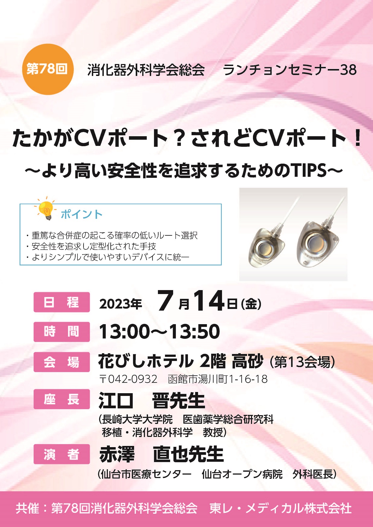 ランチョンセミナー38 たかがCVポート?されどCVポート! 〜より高い安全性を追求するためのTIPS〜 2023年7月14日(金) 13:00 - 13:50 第13会場 | 花びしホテル 2階 高砂 共催:東レ・メディカル株式会社 |