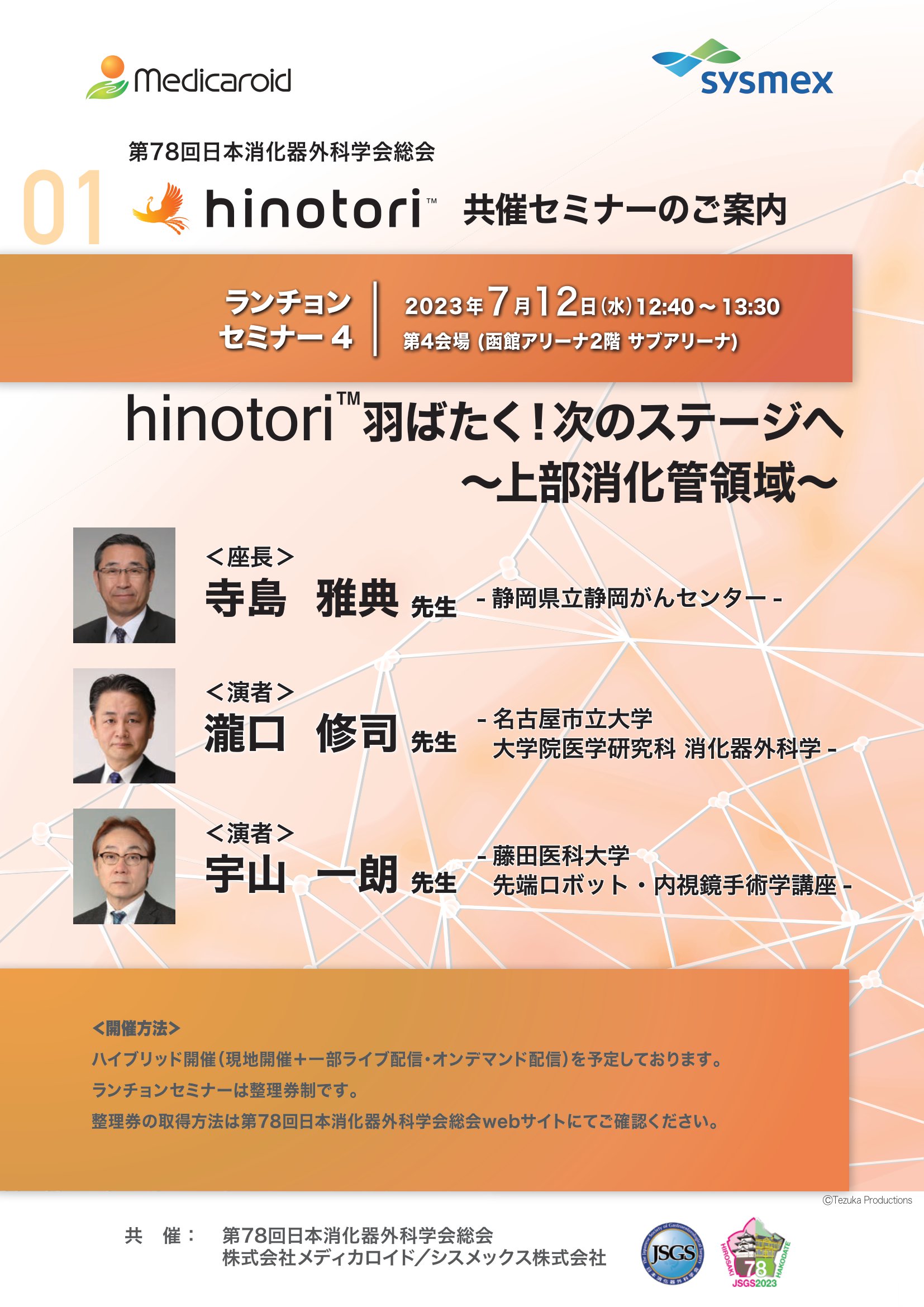 ランチョンセミナー4 hinotori™羽ばたく!次のステージへ~上部消化管領域~ 2023年7月12日(水) 12:40 - 13:30 第4会場 | 函館アリーナ 2階 サブアリーナ 共催:株式会社メディカロイド/シスメックス株式会社 |