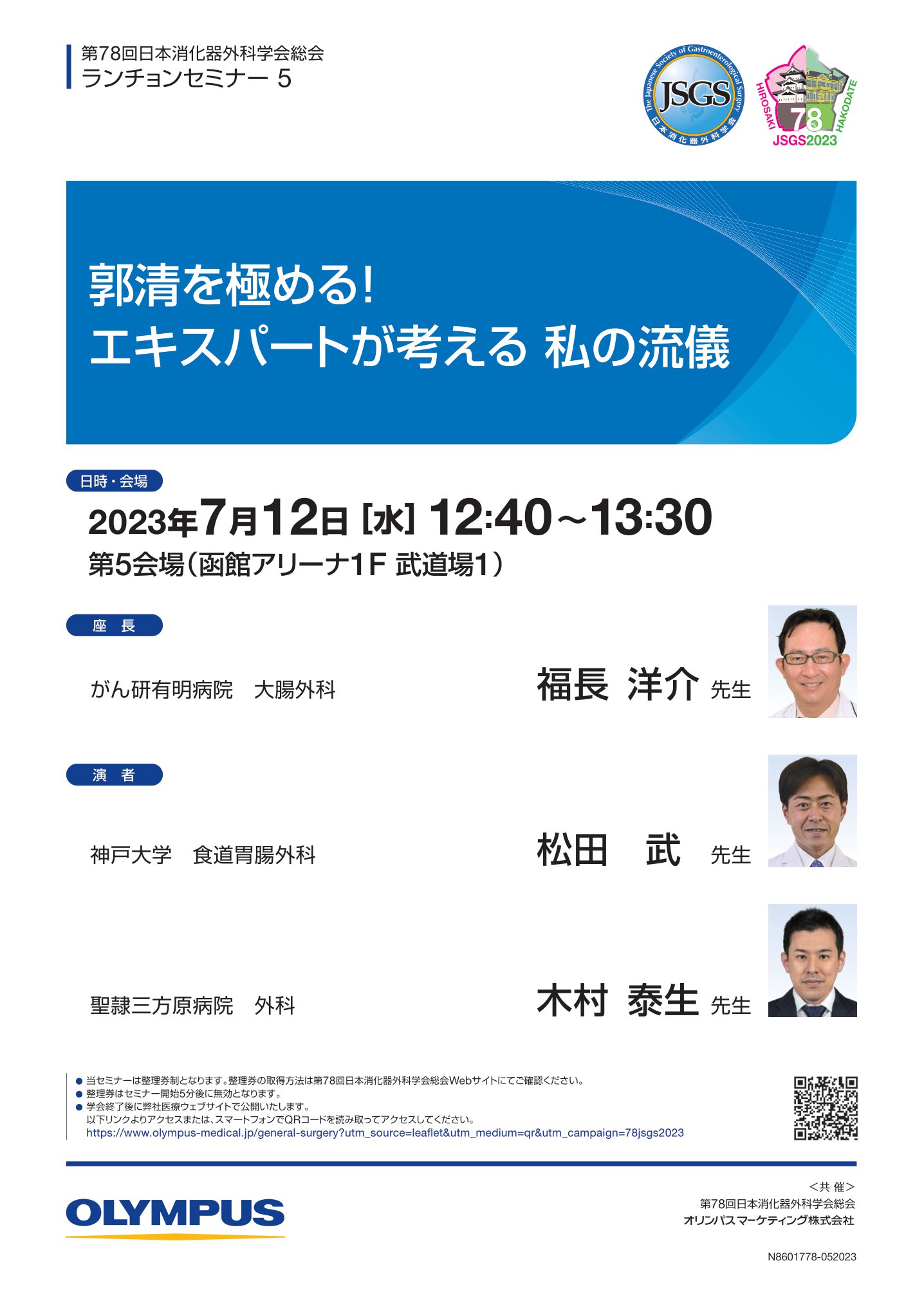 ランチョンセミナー5 郭清を極める!エキスパートが考える 私の流儀 2023年7月12日(水) 12:40 - 13:30 第5会場 | 函館アリーナ 1階 武道場1 共催:オリンパスマーケティング株式会社 |