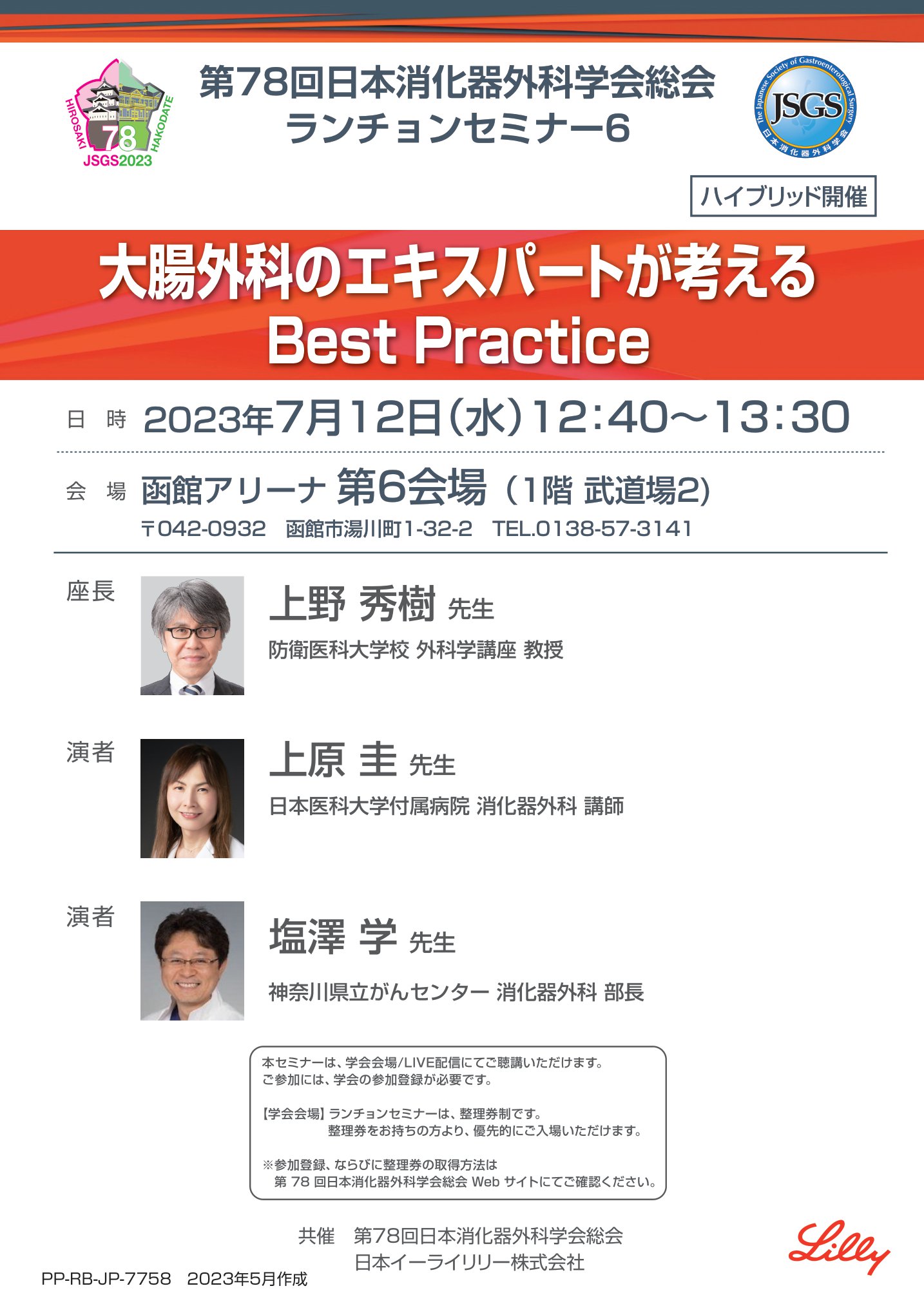 ランチョンセミナー6 大腸外科のエキスパートが考えるBest Practice 2023年7月12日(水) 12:40 - 13:30 第6会場 | 函館アリーナ 1階 武道場2 共催:日本イーライリリー株式会社 |