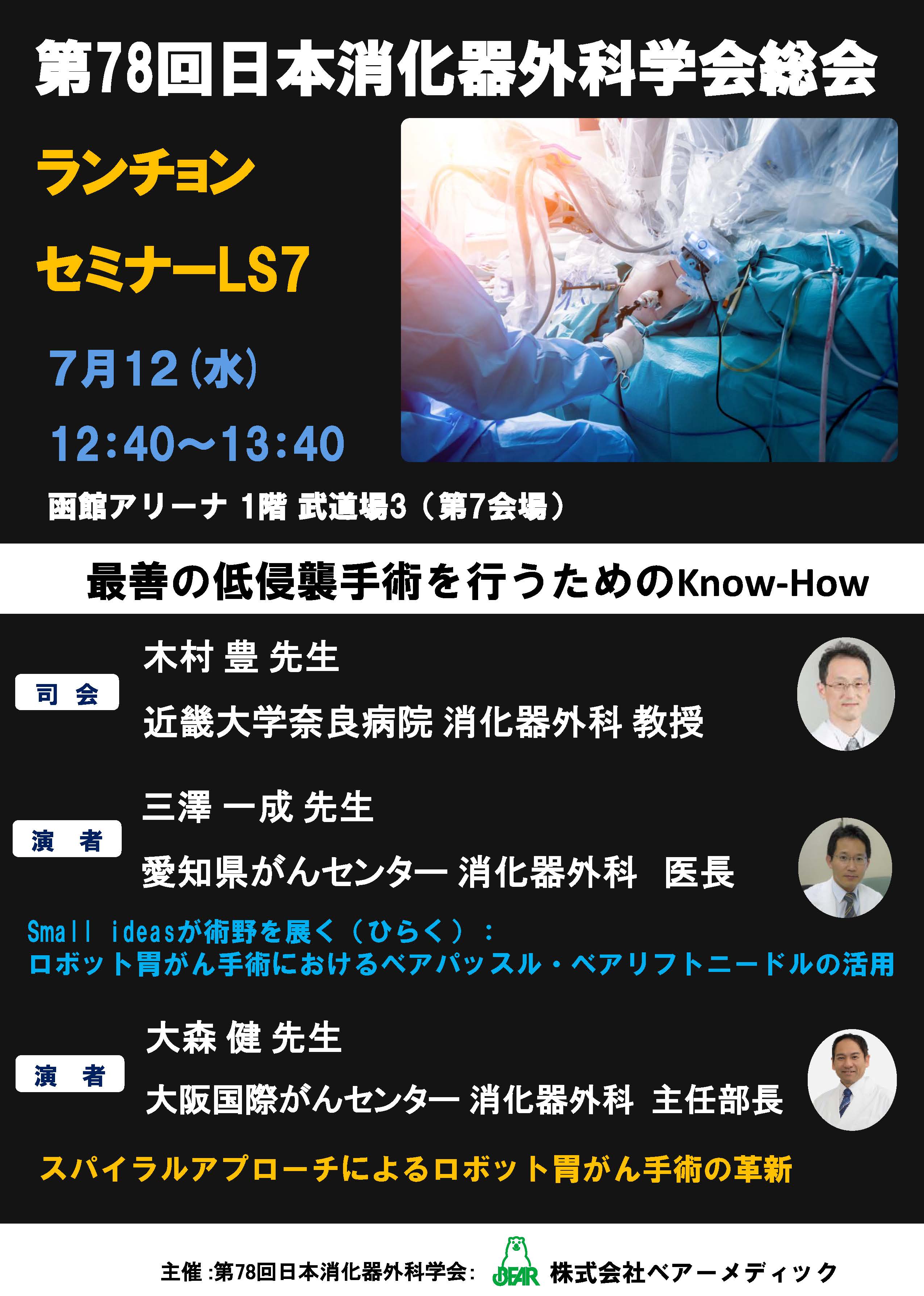 ランチョンセミナー7 最善の低侵襲手術を行うためのKnow-How 2023年7月12日(水) 12:40 - 13:30 第7会場 | 函館アリーナ 1階 武道場3 共催:株式会社ベアーメディック |