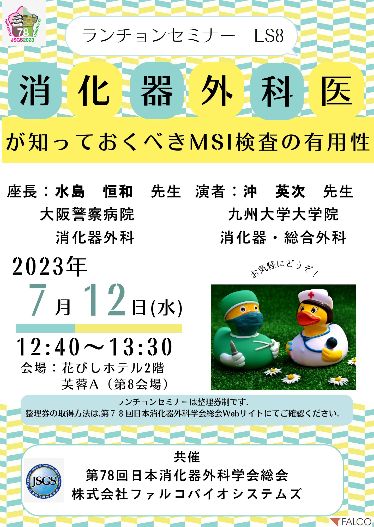 ランチョンセミナー8 消化器外科医が知っておくべきMSI検査の有用性 2023年7月12日(水) 12:40 - 13:30 第8会場 | 花びしホテル 2階 芙蓉A 共催:株式会社ファルコバイオシステムズ |