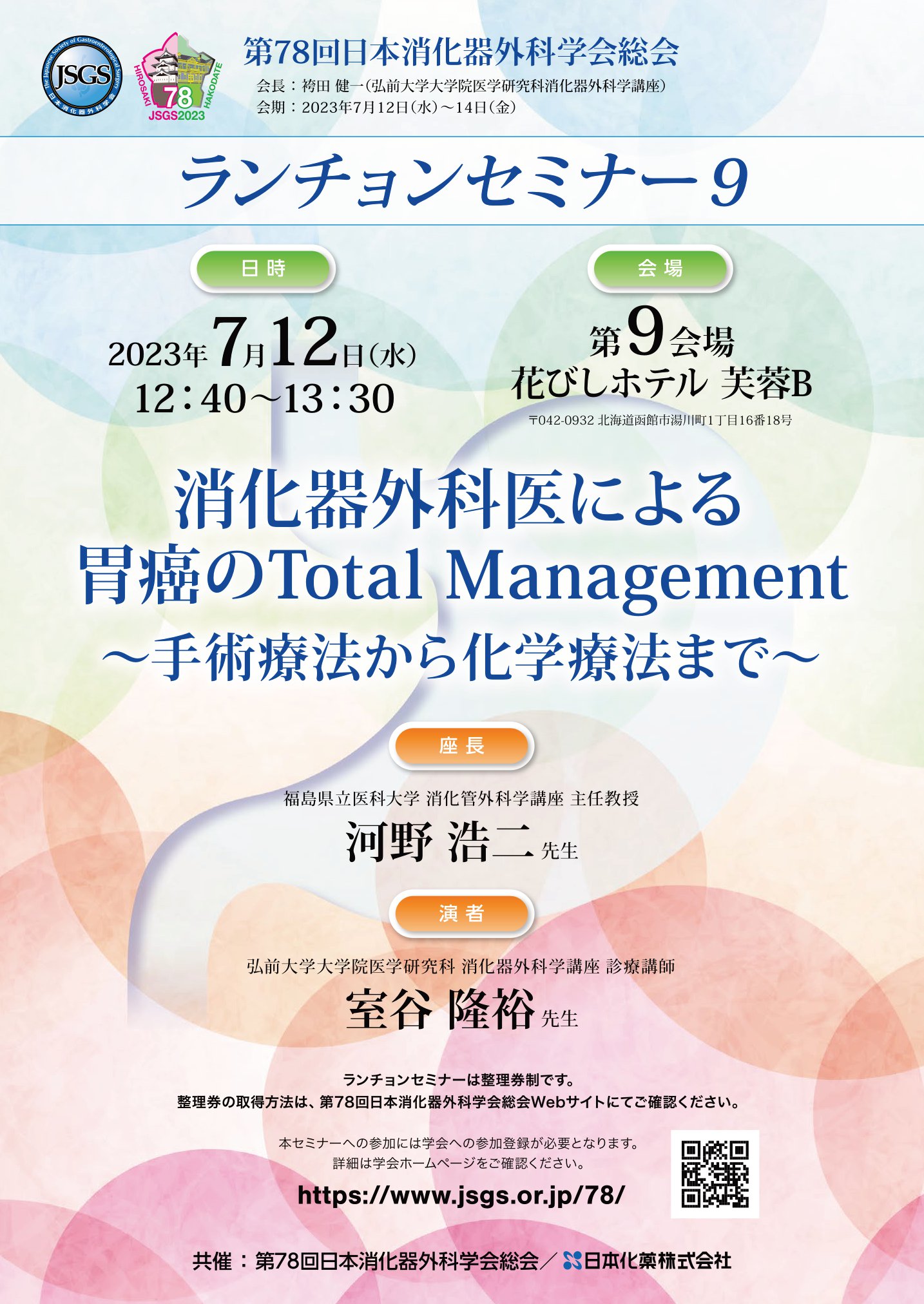 ランチョンセミナー9 消化器外科医による胃癌のTotal Management~ 手術療法から化学療法まで ~ 2023年7月12日(水) 12:40 - 13:30 第9会場 | 花びしホテル 2階 芙蓉B 共催:日本化薬株式会社 |
