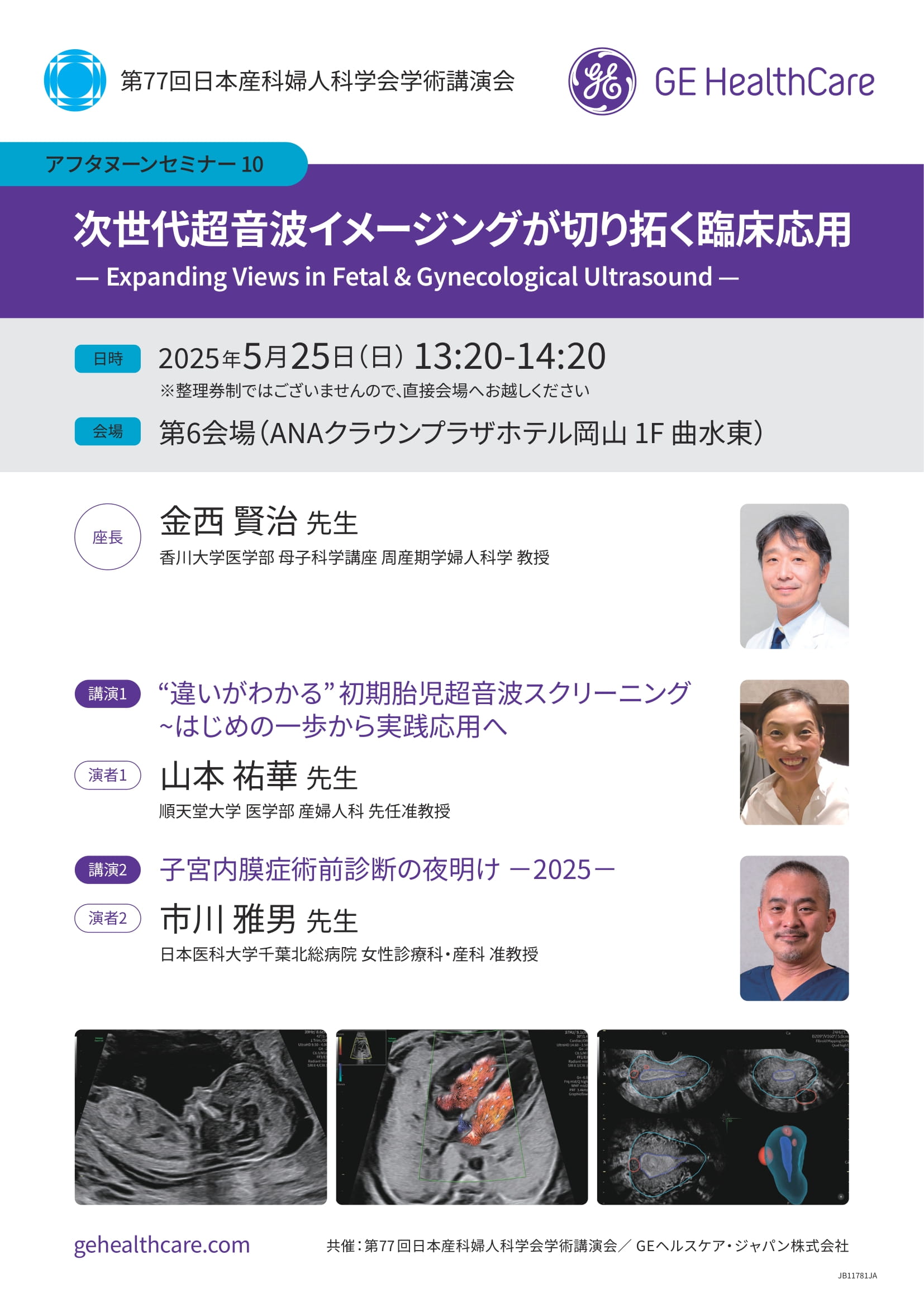 アフタヌーンセミナー10 次世代超音波イメージングが切り拓く臨床応用―Expanding Views in Fetal & Gynecological Ultrasound― 2025年5月25日(日) 13:20 - 14:20 第6会場 | ANAクラウンプラザホテル岡山 1F 曲水東 共催:GEヘルスケア・ジャパン株式会社 |
