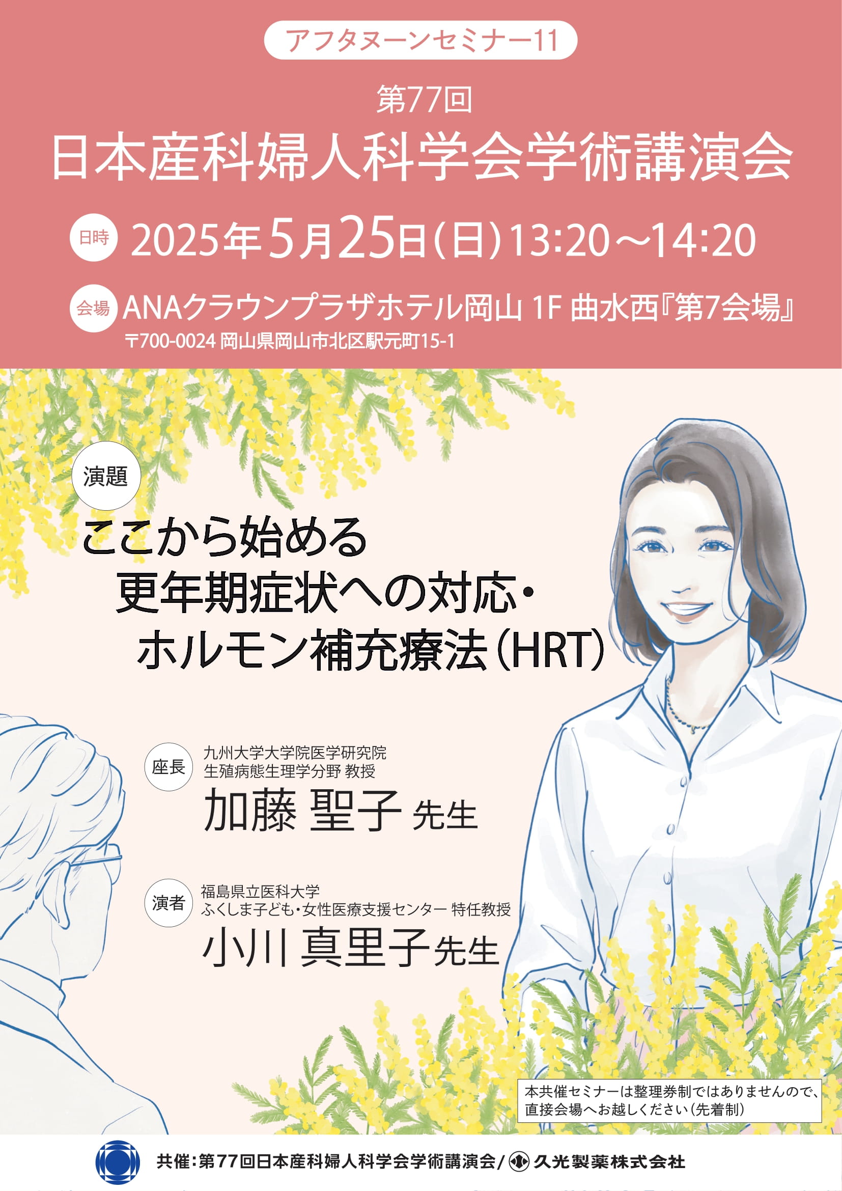 アフタヌーンセミナー11 ここから始める更年期症状への対応・ホルモン補充療法(HRT) 2025年5月25日(日) 13:20 - 14:20 第7会場 | ANAクラウンプラザホテル岡山 1F 曲水西 共催:久光製薬株式会社 |