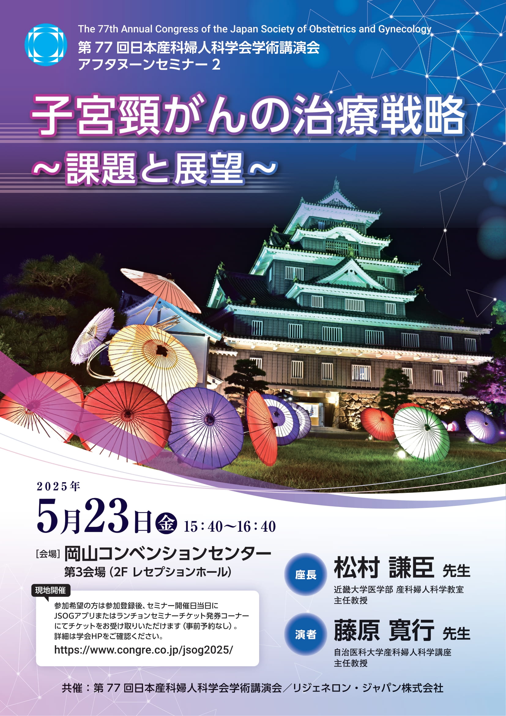 アフタヌーンセミナー2 再発子宮頸がんの薬物療法2025 2025年5月23日(金) 15:40 - 16:40 第3会場 | 岡山コンベンションセンター 2F レセプションホール 共催:リジェネロン・ジャパン株式会社 |