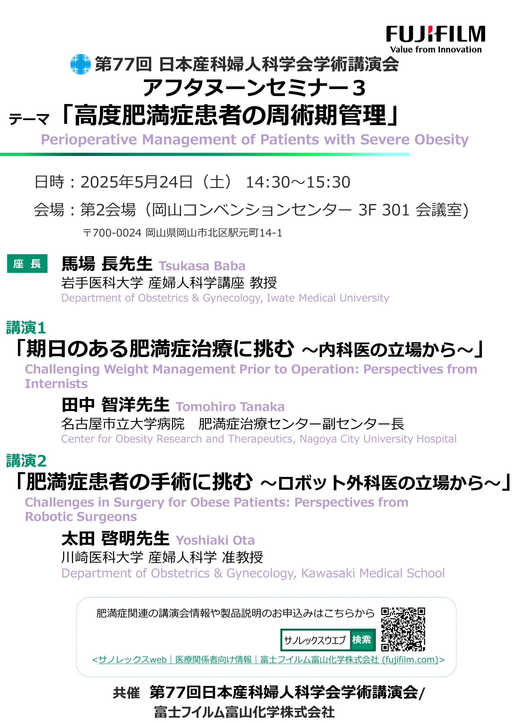 アフタヌーンセミナー3 高度肥満症患者の周術期管理 2025年5月24日(土) 14:30 - 15:30 第2会場 | 岡山コンベンションセンター 3F 301会議室 共催:富士フイルム富山化学株式会社 |