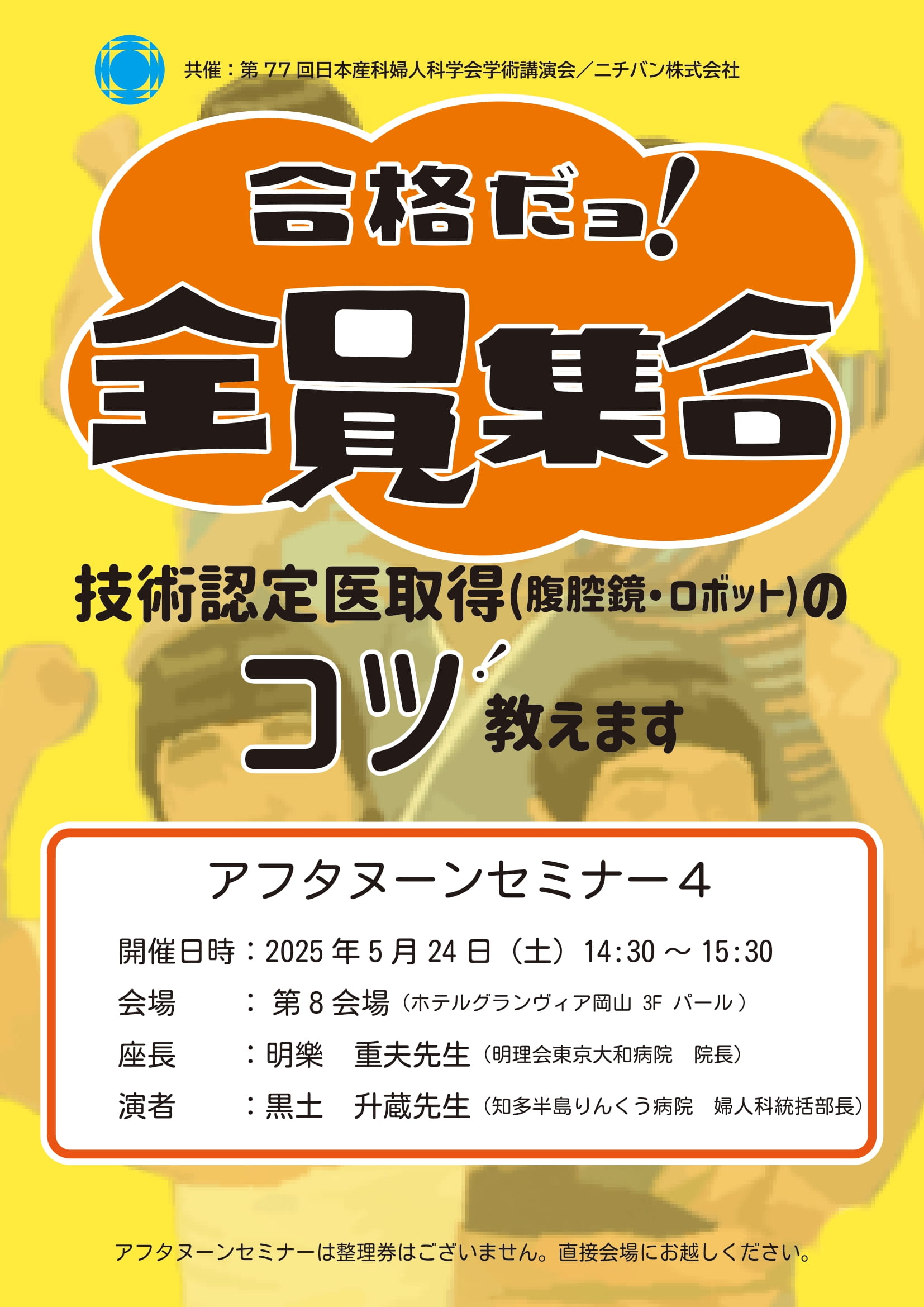 アフタヌーンセミナー4 合格だよ!全員集合! 技術認定医(腹腔鏡・ロボット) 取得のコツ教えます 2025年5月24日(土) 14:30 - 15:30 第8会場 | ホテルグランヴィア岡山 3F パール 共催:ニチバン株式会社 |