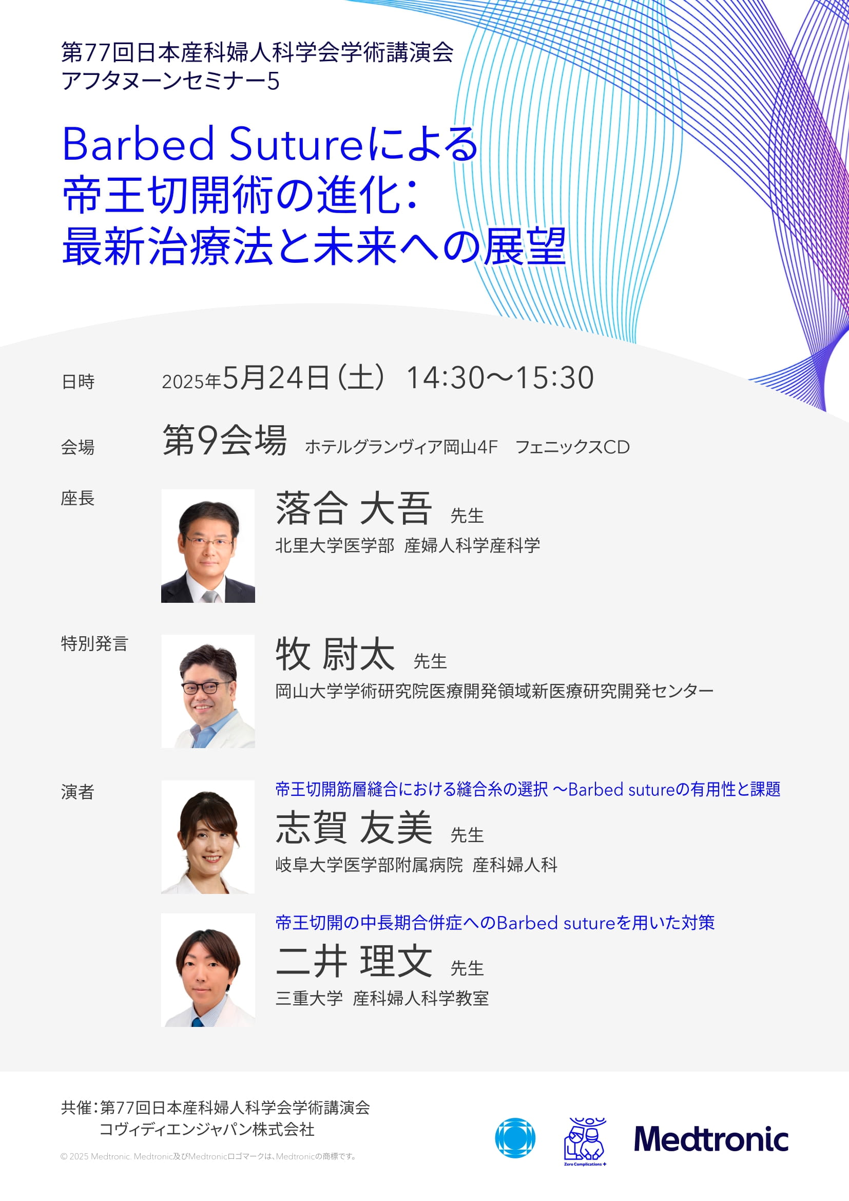アフタヌーンセミナー5 Barbed Sutureによる帝王切開術の進化:最新治療法と未来への展望 2025年5月24日(土) 14:30 - 15:30 第9会場 | ホテルグランヴィア岡山 4F フェニックスCD 共催:コヴィディエンジャパン株式会社 |