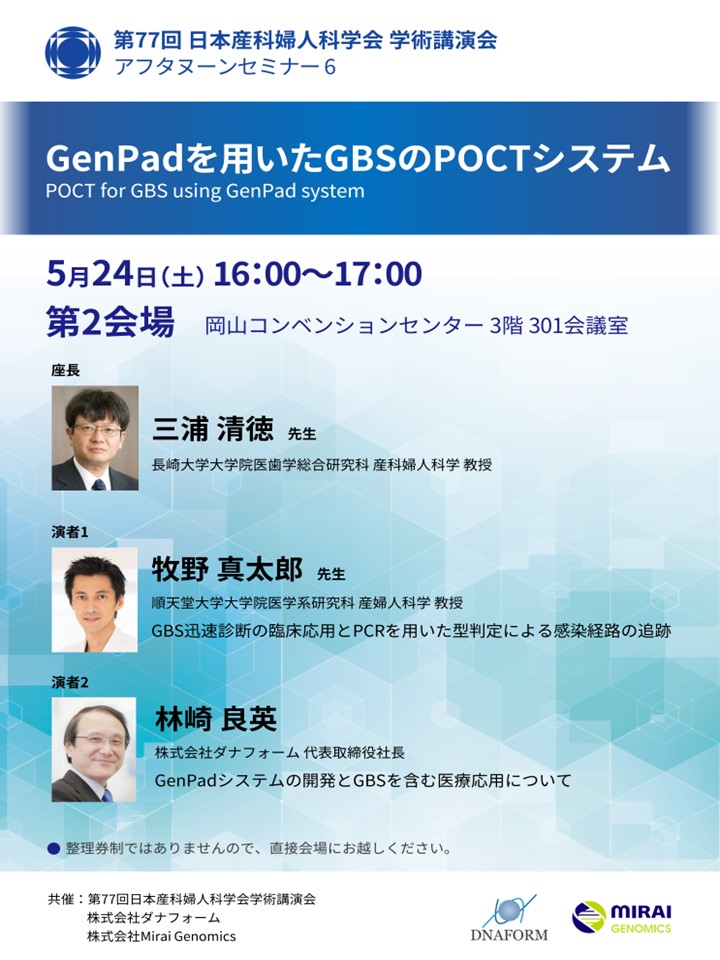 アフタヌーンセミナー6 GenPadを用いたGBSのPOCTシステム 2025年5月24日(土) 16:00 - 17:00 第2会場 | 岡山コンベンションセンター 3F 301会議室 共催:株式会社ダナフォーム/株式会社Mirai Genomics |