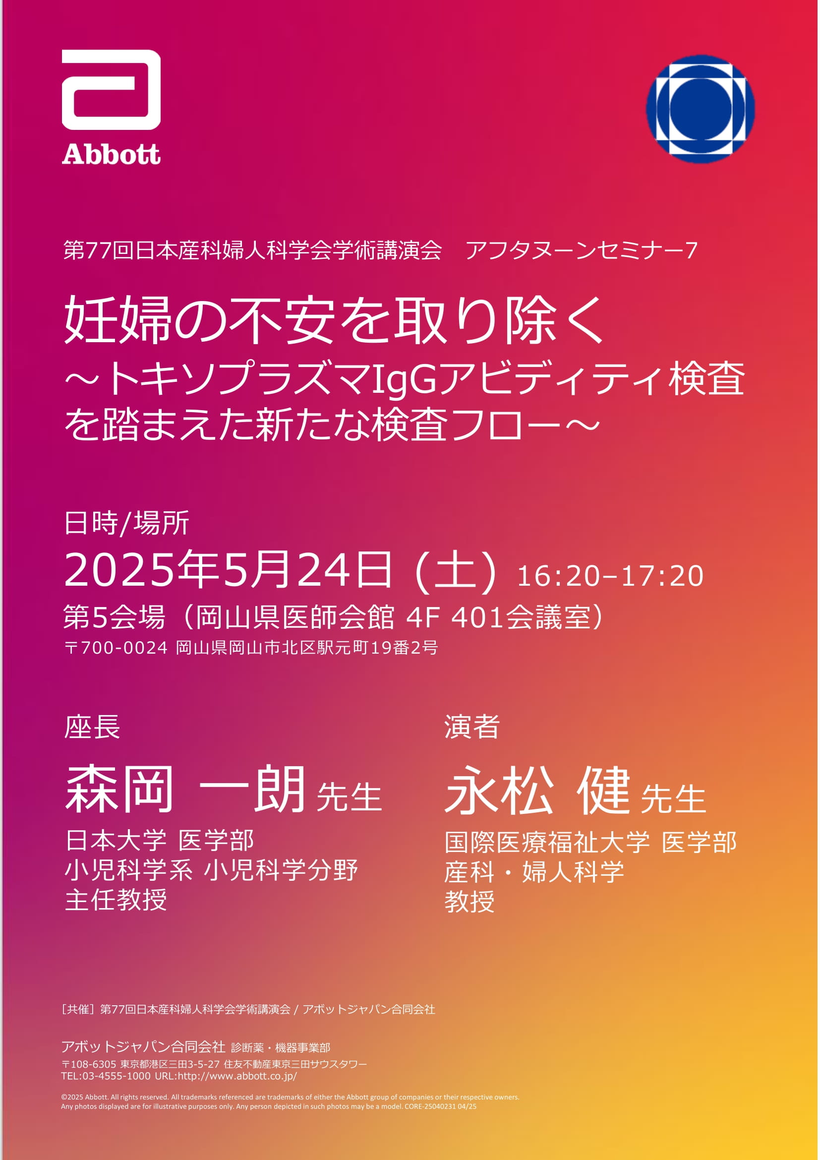 アフタヌーンセミナー7 妊婦の不安を取り除く~トキソプラズマIgGアビディティ検査を踏まえた新たな検査フロー~ 2025年5月24日(土) 16:20 - 17:20 第5会場 | 岡山県医師会館 4F 401会議室 共催:アボットジャパン合同会社 |