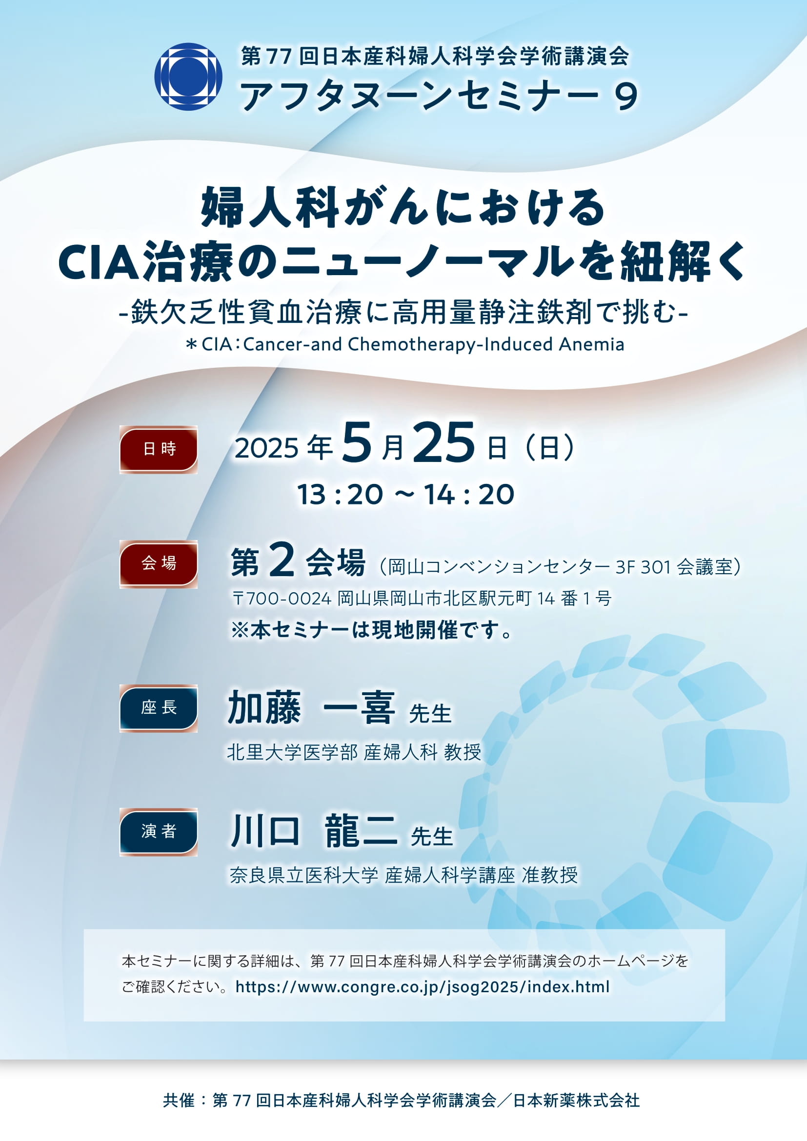 アフタヌーンセミナー9 婦人科がんにおけるCIA治療のニューノーマルを紐解く―鉄欠乏性貧血治療に高用量静注鉄剤で挑む― *CIA:Cancer-and Chemotherapy-Induced Anemia 2025年5月25日(日) 13:20 - 14:20 第2会場 | 岡山コンベンションセンター 3F 301会議室 共催:日本新薬株式会社 |