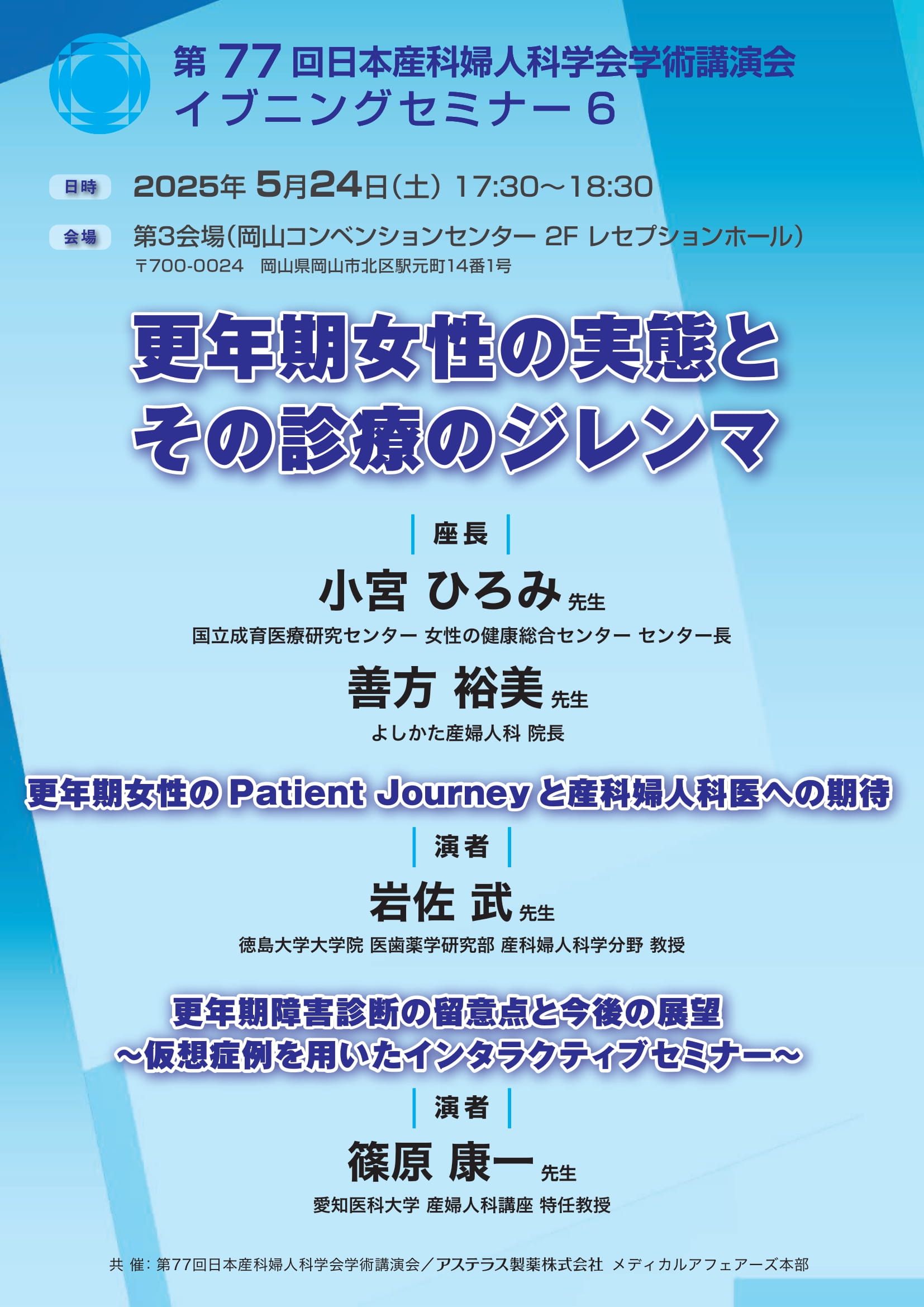 イブニングセミナー6 更年期女性の実態とその診療のジレンマ 2025年5月24日(土) 17:30 - 18:30 第3会場 | 岡山コンベンションセンター 2F レセプションホール 共催:アステラス製薬株式会社 メディカルアフェアーズ本部 |
