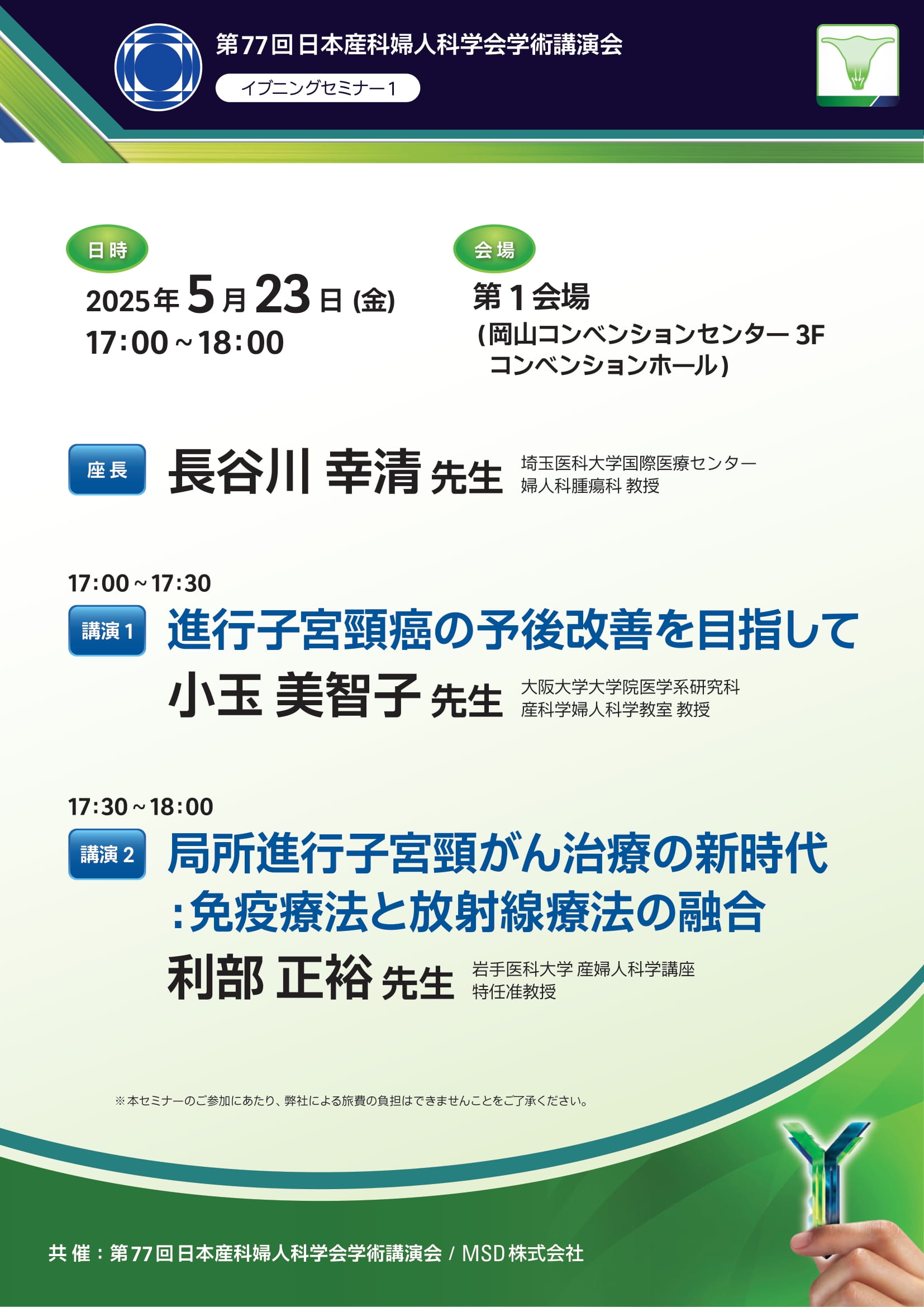 | イブニングセミナー9 子宮頸癌に対する抗体薬治療の新機軸 2025年5月24日(土) 17:30 - 18:30 第8会場 | ホテルグランヴィア岡山 3F パール 共催:中外製薬株式会社 |