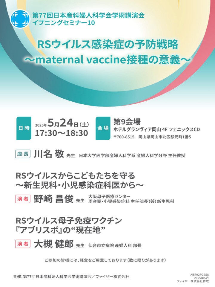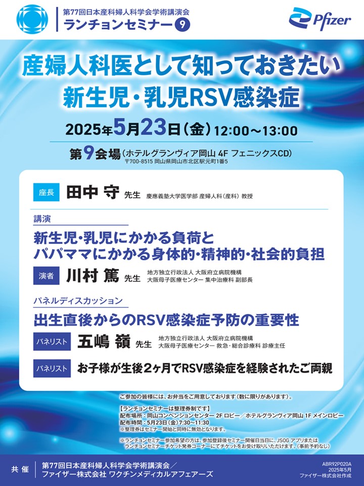 ランチョンセミナー9 産婦人科医として知っておきたい 新生児・乳児RSV感染症 2025年5月23日(金) 12:00 - 13:00 第9会場 | ホテルグランヴィア岡山 4F フェニックスCD 共催:ファイザー株式会社 ワクチンメディカルアフェアーズ |