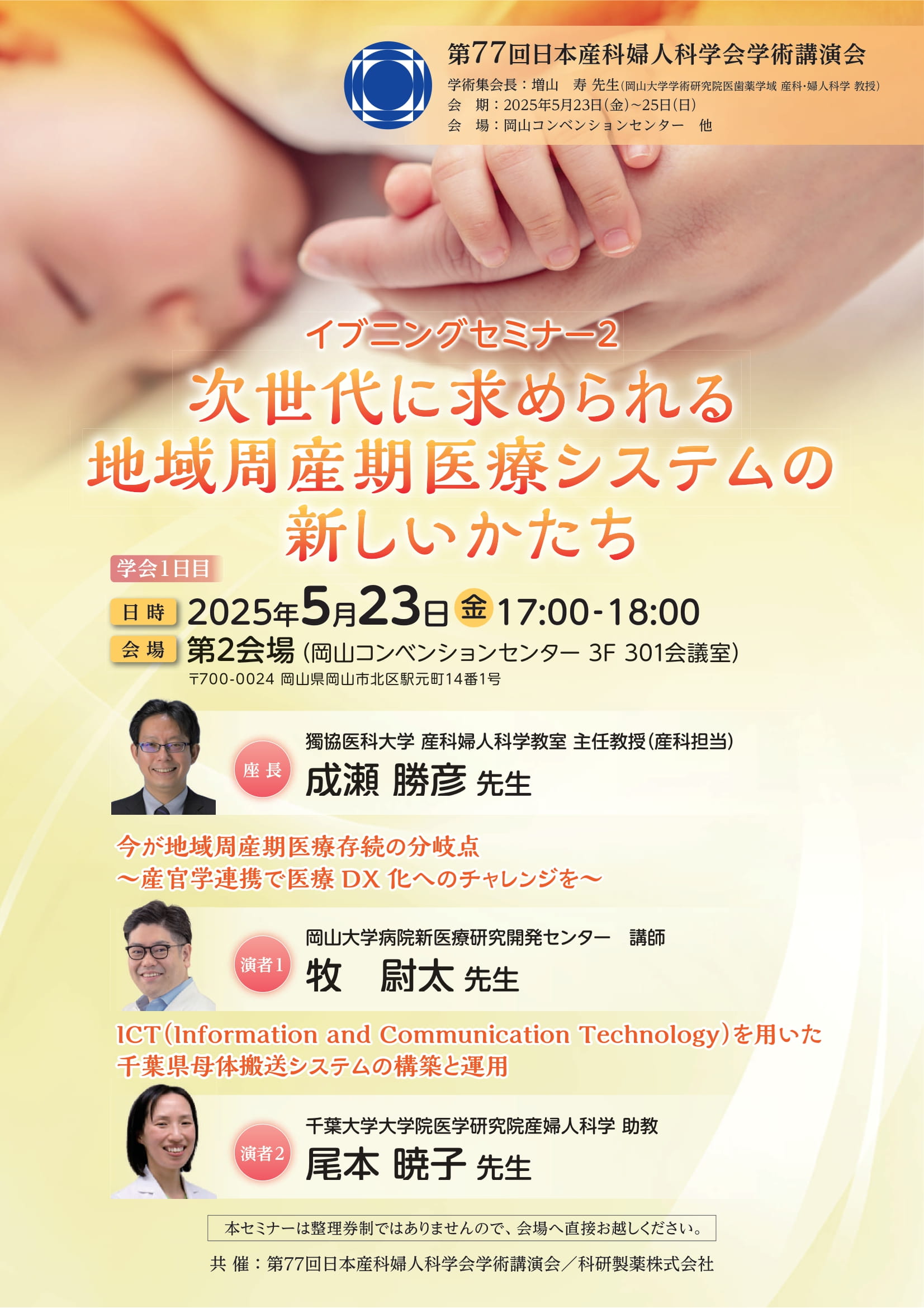 イブニングセミナー2 次世代に求められる地域周産期医療システムの新しいかたち 2025年5月23日(金) 17:00 - 18:00 第2会場 | 岡山コンベンションセンター 3F 301会議室 共催:科研製薬株式会社 |