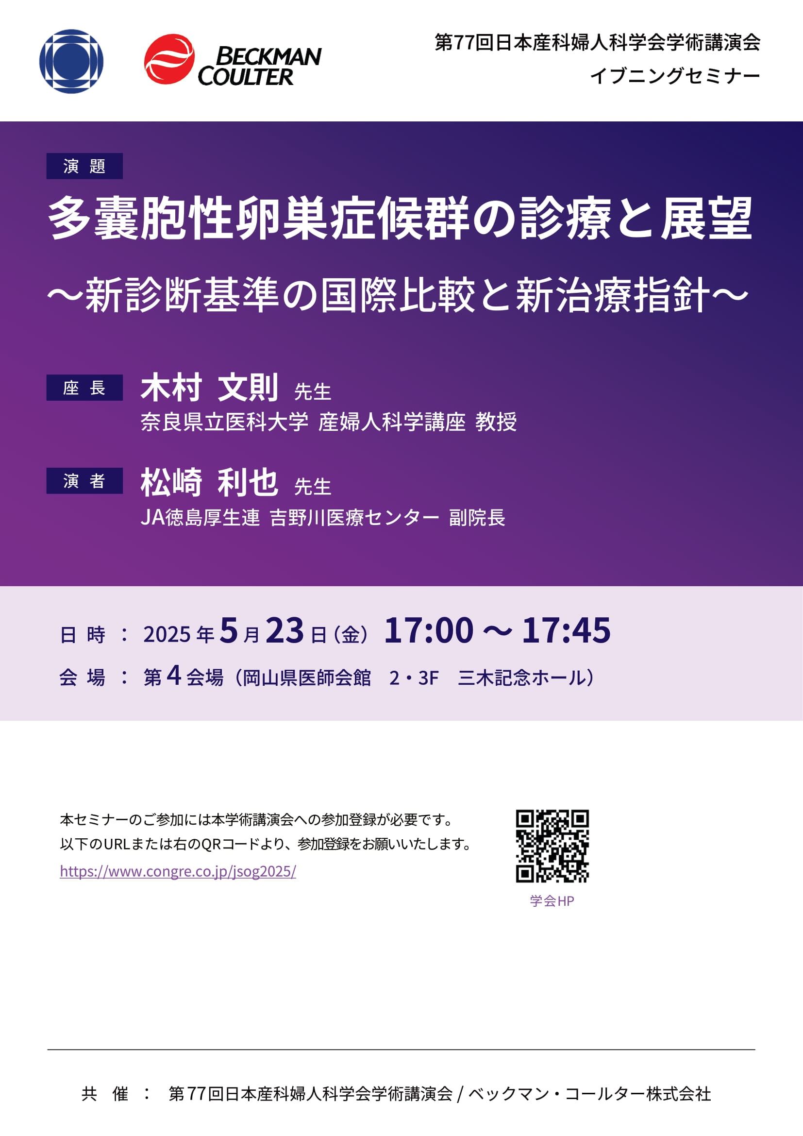 イブニングセミナー3 多囊胞性卵巣症候群の診療の展望 〜新診断基準の国際比較と新治療指針〜 2025年5月23日(金) 17:00 - 17:45 第4会場 | 岡山県医師会館 2・3F 三木記念ホール 共催:ベックマン・コールター株式会社 |