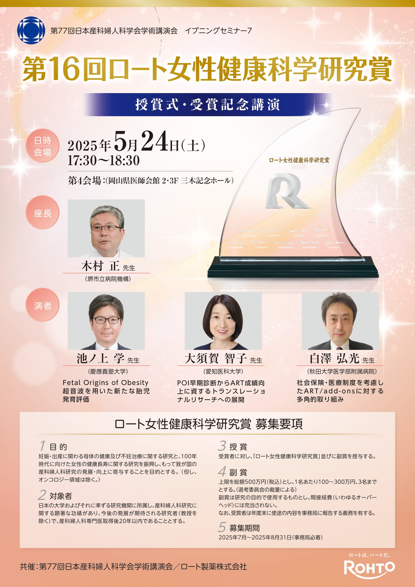 イブニングセミナー7 第16回ロート女性健康科学研究賞 授賞式・受賞記念講演 2025年5月24日(土) 17:30 - 18:30 第4会場 | 岡山県医師会館 2・3F 三木記念ホール 共催:ロート製薬株式会社 |