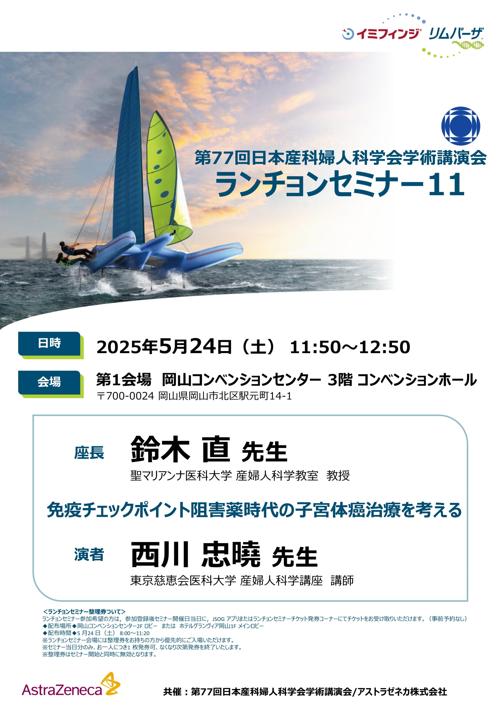ランチョンセミナー11 免疫チェックポイント阻害薬時代の子宮体癌治療を考える 2025年5月24日(土) 11:50 - 12:50 第1会場 | 岡山コンベンションセンター 3F コンベンションホール 共催:アストラゼネカ株式会社 |