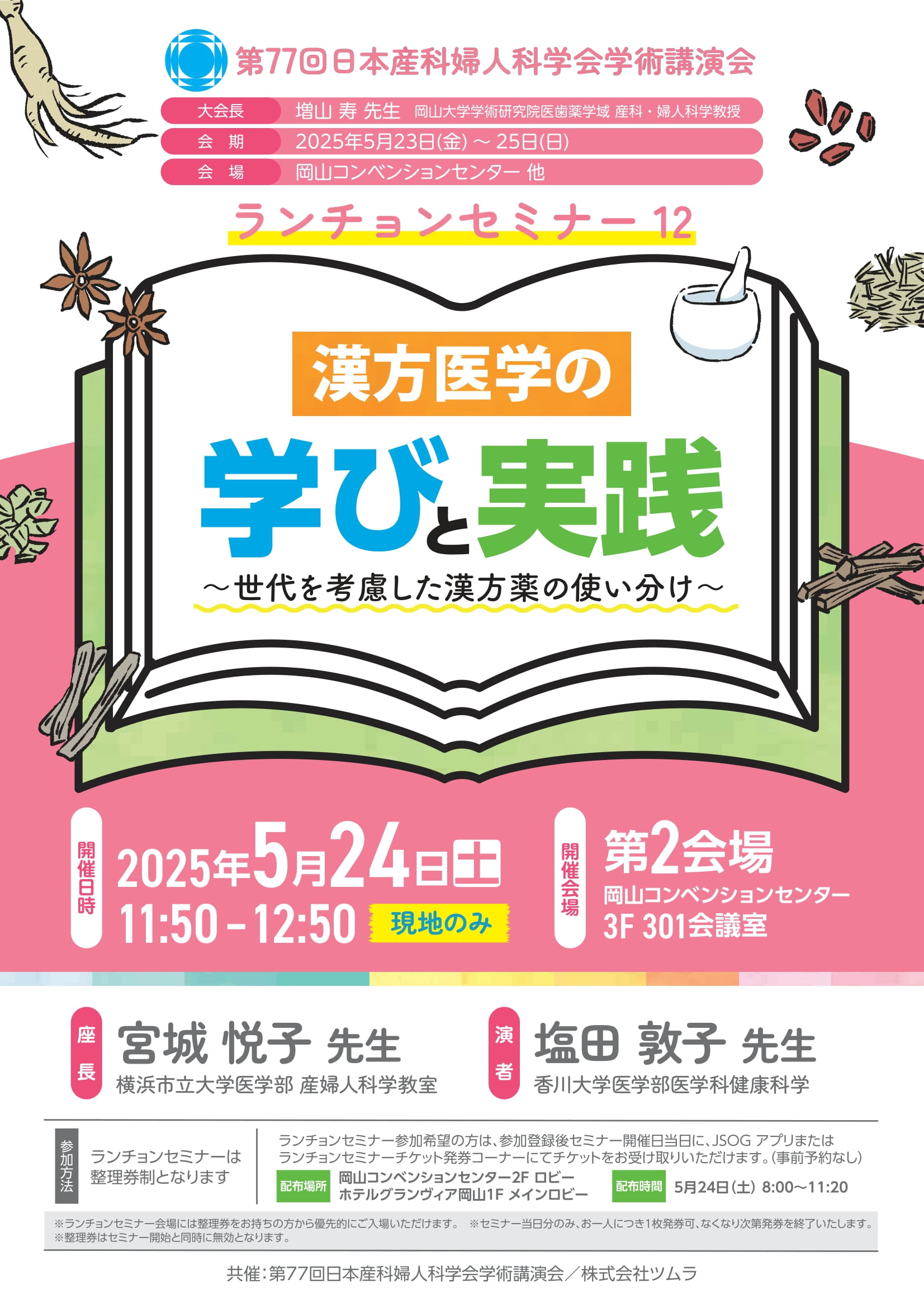 ランチョンセミナー12 漢方医学の学びと実践~世代を考慮した漢方薬の使い分け~ 2025年5月24日(土) 11:50 - 12:50 第2会場 | 岡山コンベンションセンター 3F 301会議室 共催:株式会社ツムラ |