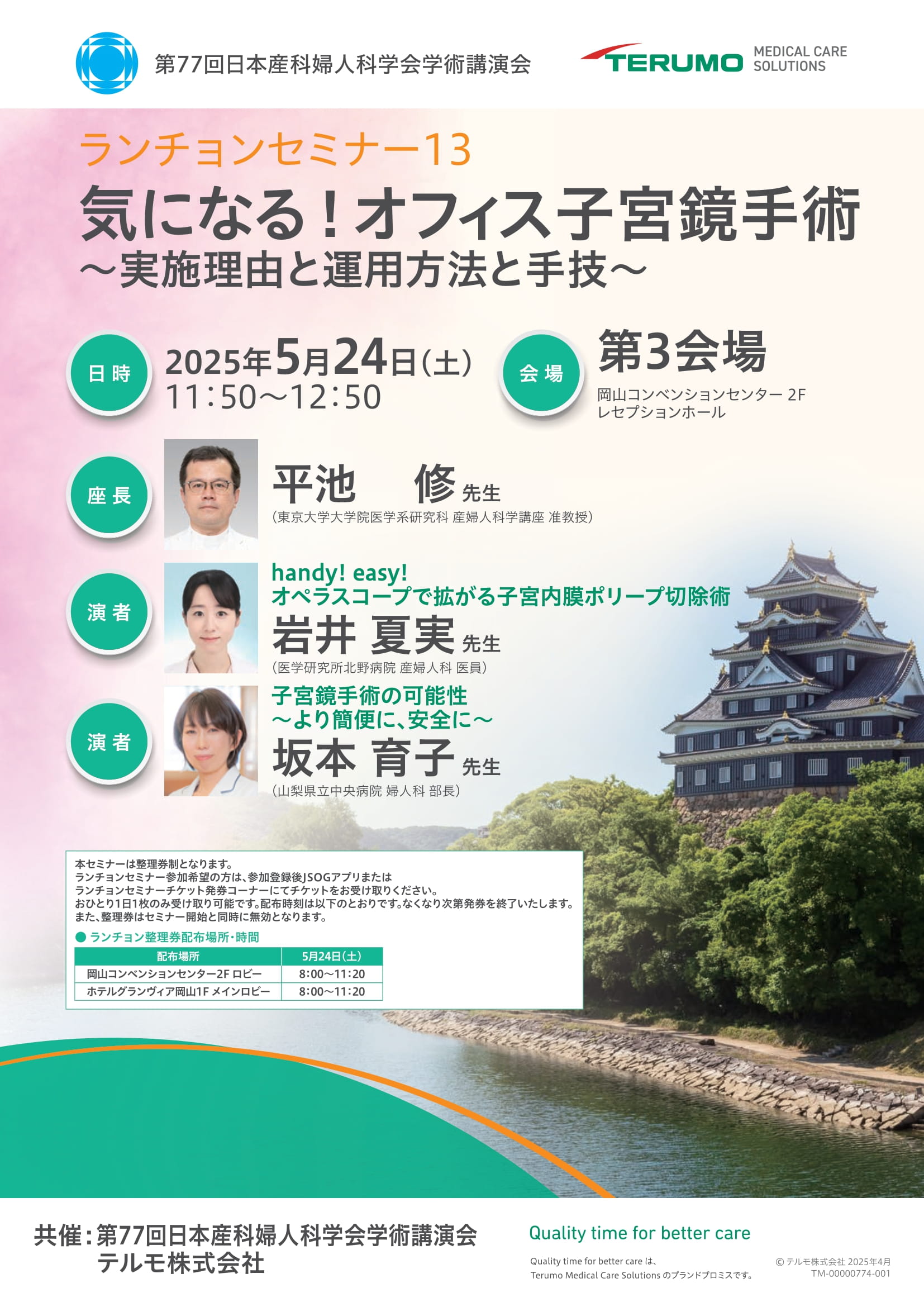ランチョンセミナー13 気になる!オフィス子宮鏡手術~実施理由と運用方法と手技~ 2025年5月24日(土) 11:50 - 12:50 第3会場 | 岡山コンベンションセンター 2F レセプションホール 共催:テルモ株式会社 |