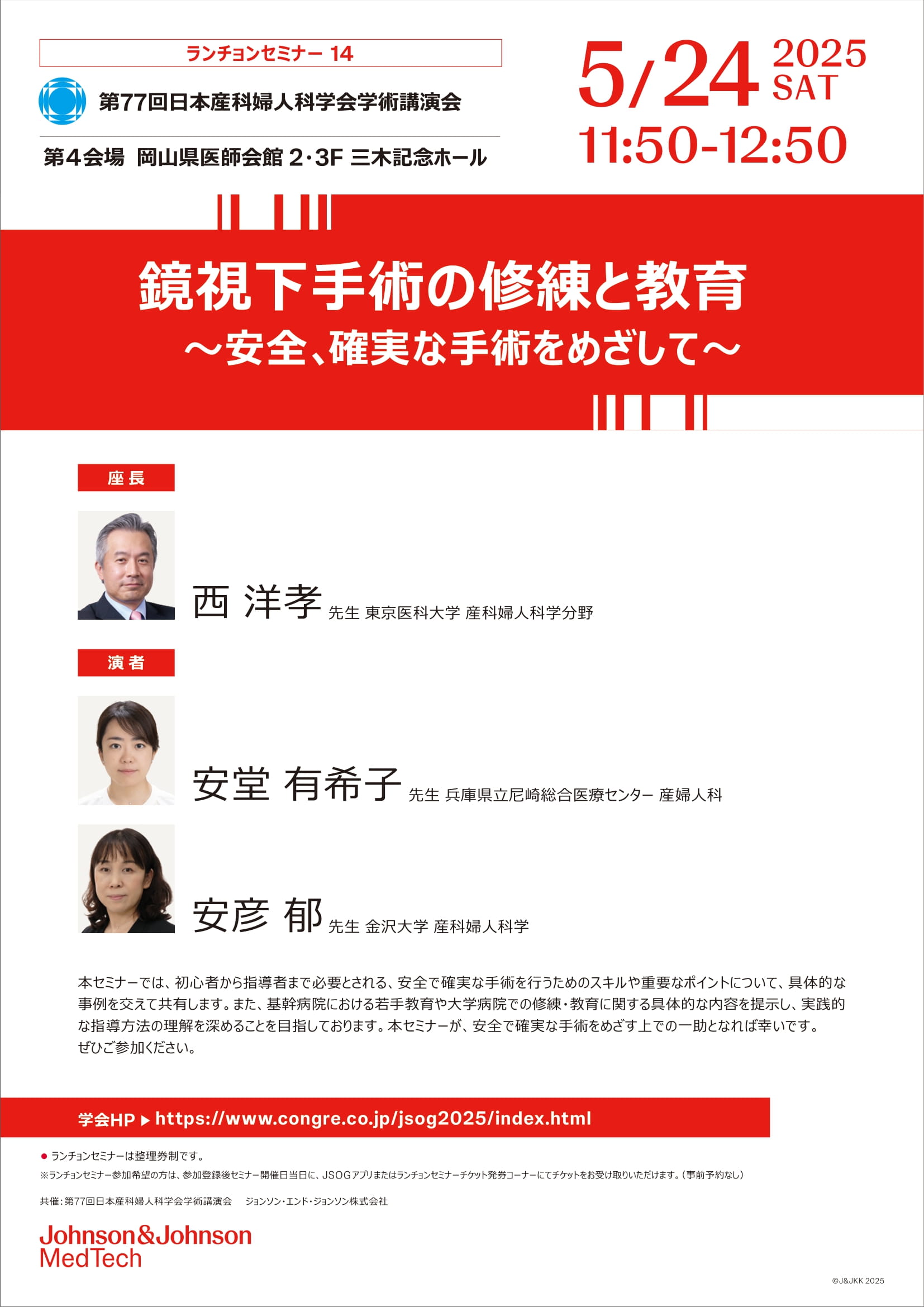 ランチョンセミナー14 鏡視下手術の修練と教育 ~安全,確実な手術をめざして~ 2025年5月24日(土) 11:50 - 12:50 第4会場 | 岡山県医師会館 2・3F 三木記念ホール 共催:ジョンソン・エンド・ジョンソン株式会社 |