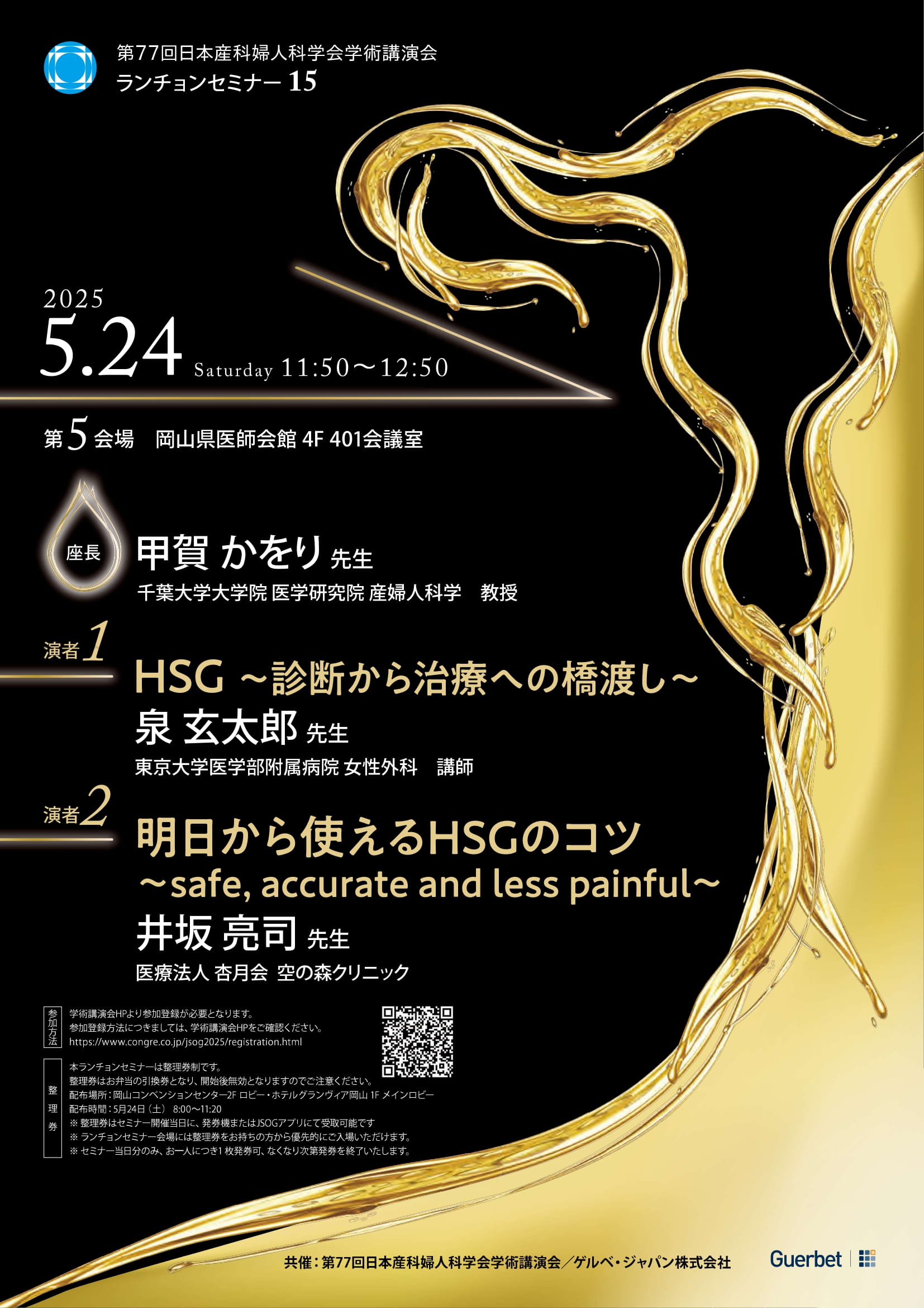 ランチョンセミナー15 子宮卵管造影 2025年5月24日(土) 11:50 - 12:50 第5会場 | 岡山県医師会館 4F 401会議室 共催:ゲルべ・ジャパン株式会社 |