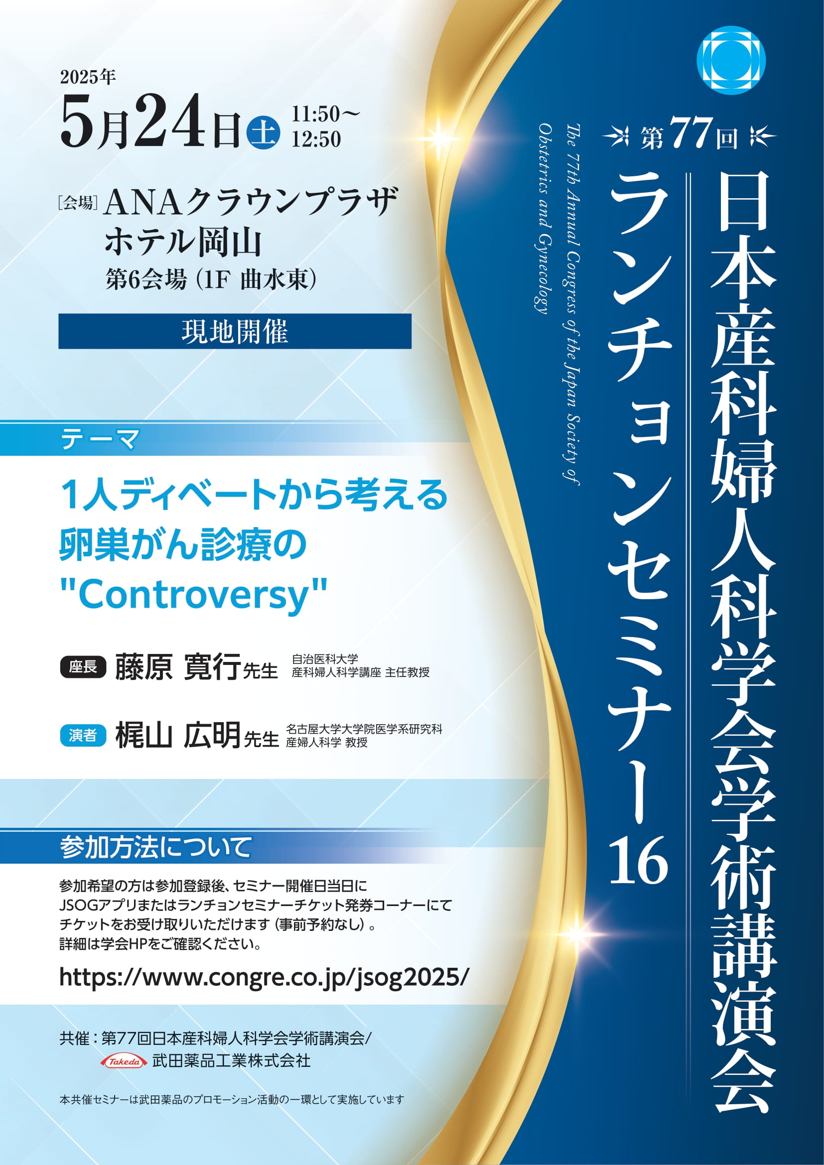 ランチョンセミナー16 1人ディベートから考える卵巣がん診療の“Controversy” 2025年5月24日(土) 11:50 - 12:50 第6会場 | ANAクラウンプラザホテル岡山 1F 曲水東 共催:武田薬品工業株式会社 |