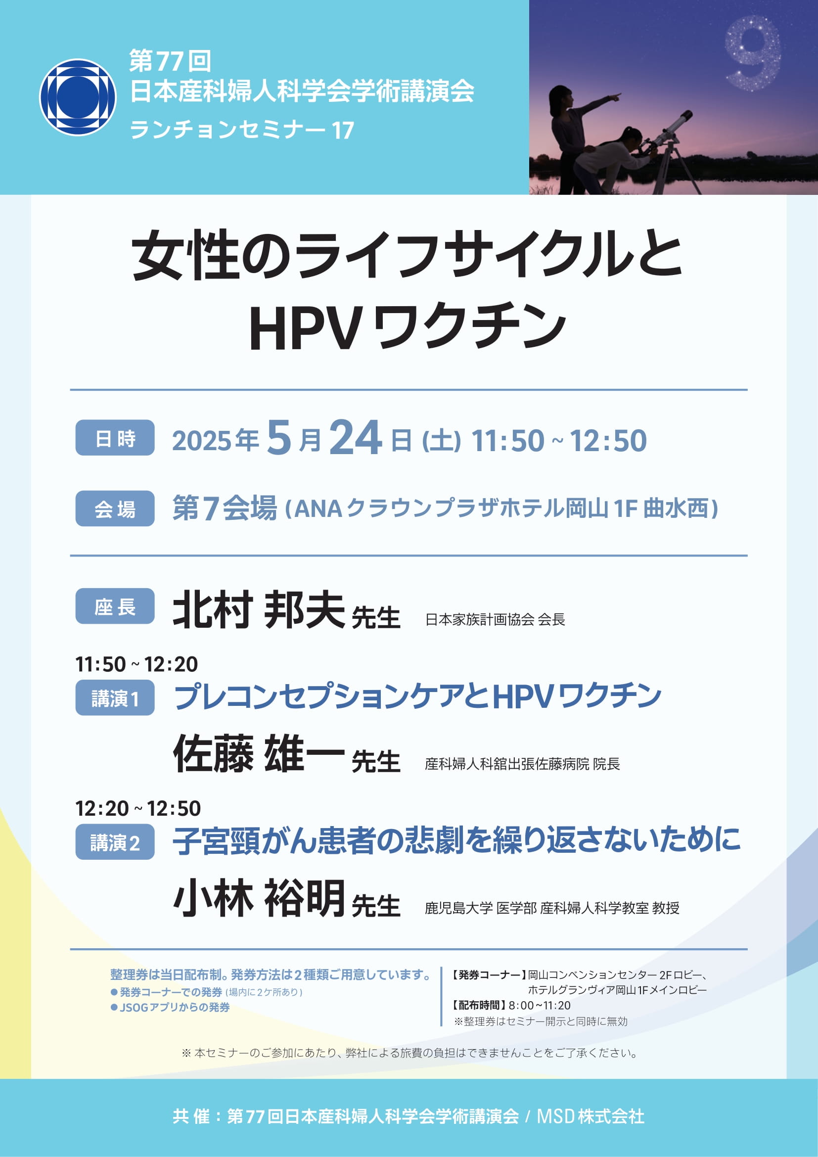 ランチョンセミナー17 女性のライフサイクルとHPVワクチン 2025年5月24日(土) 11:50 - 12:50 第7会場 | ANAクラウンプラザホテル岡山 1F 曲水西 共催:MSD株式会社 |