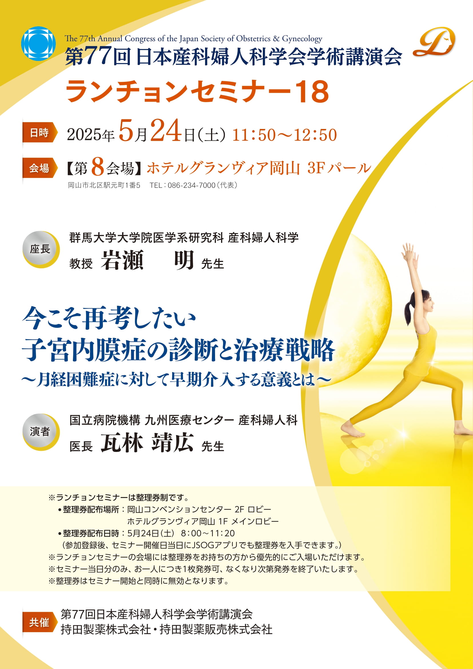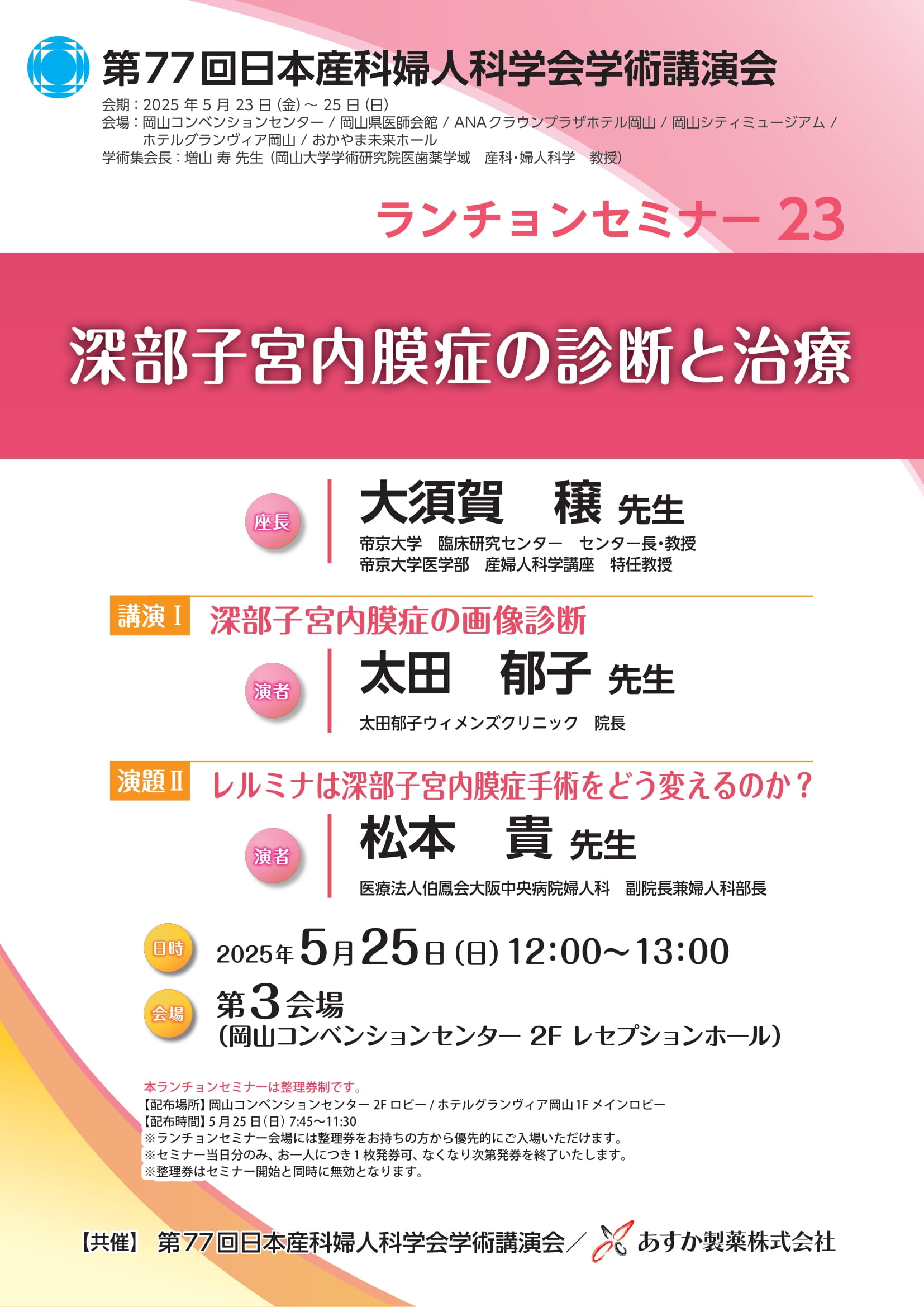 ランチョンセミナー23 深部子宮内膜症の診断と治療 2025年5月25日(日) 12:00 - 13:00 第3会場 | 岡山コンベンションセンター 2F レセプションホール 共催:あすか製薬株式会社 |