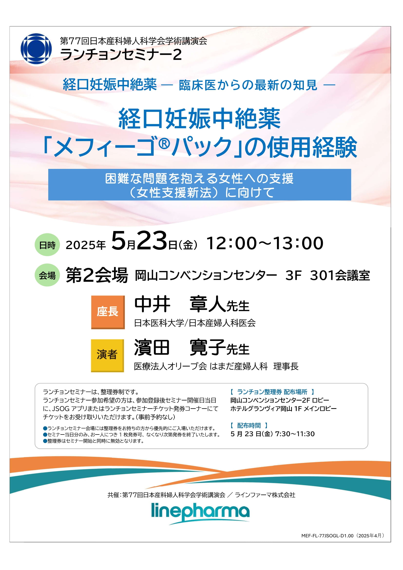 ランチョンセミナー2 経口妊娠中絶薬 ―臨床医からの最新の知見― 2025年5月23日(金) 12:00 - 13:00 第2会場 | 岡山コンベンションセンター 3F 301会議室 共催:ラインファーマ株式会社 |