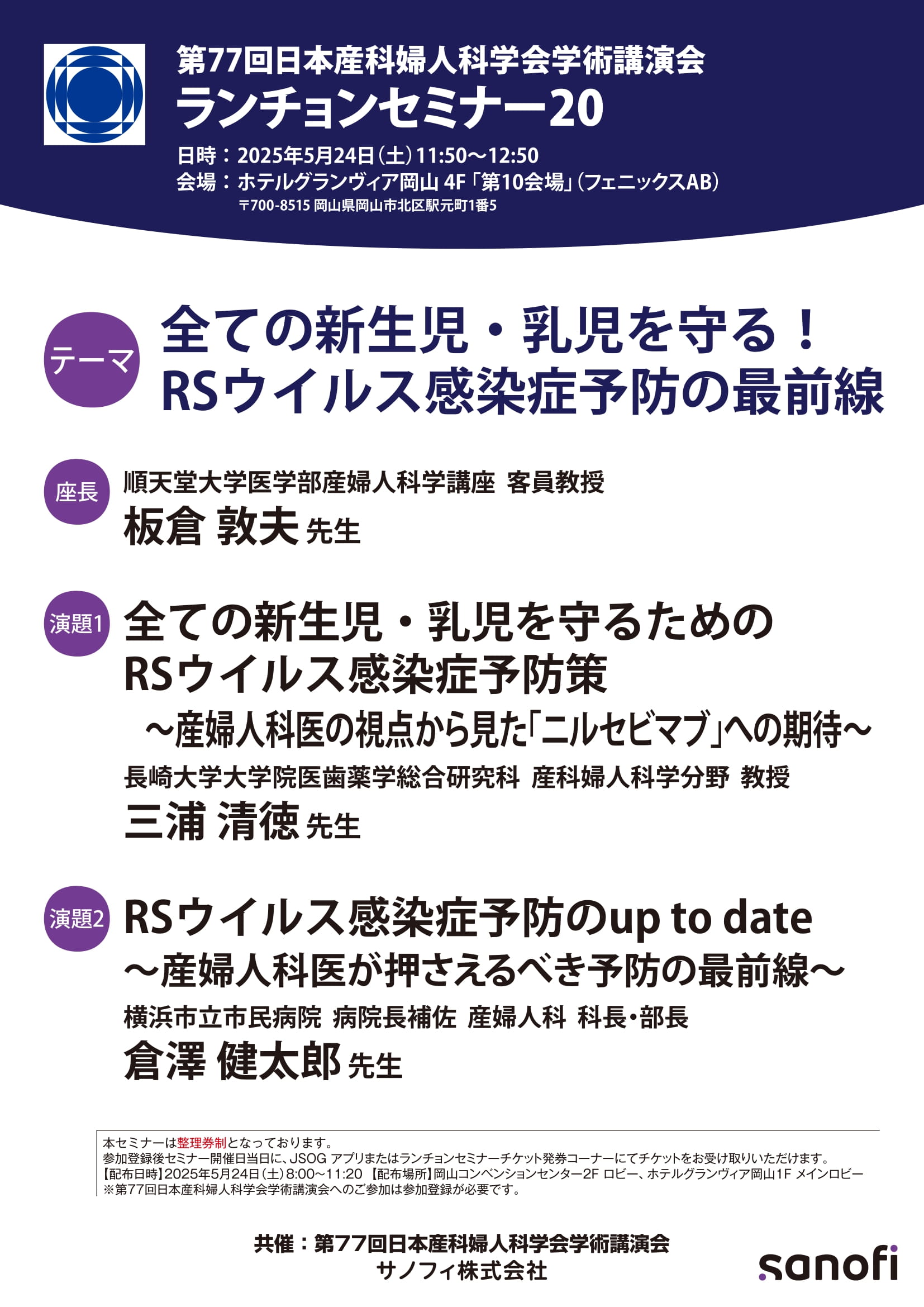 ランチョンセミナー20 全ての新生児・乳児を守る!RSウイルス感染症予防の最前線 2025年5月24日(土) 11:50 - 12:50 第10会場 | ホテルグランヴィア岡山 4F フェニックスAB 共催:サノフィ株式会社 |