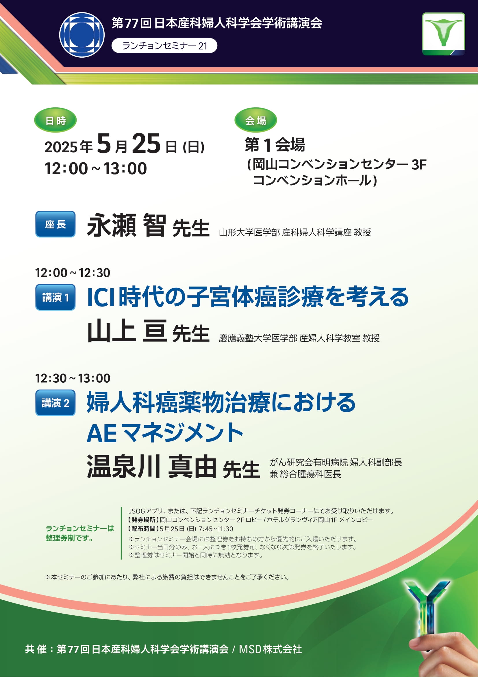 ランチョンセミナー21 2025年5月25日(日) 12:00 - 13:00 第1会場 | 岡山コンベンションセンター 3F コンベンションホール 共催:MSD株式会社 |