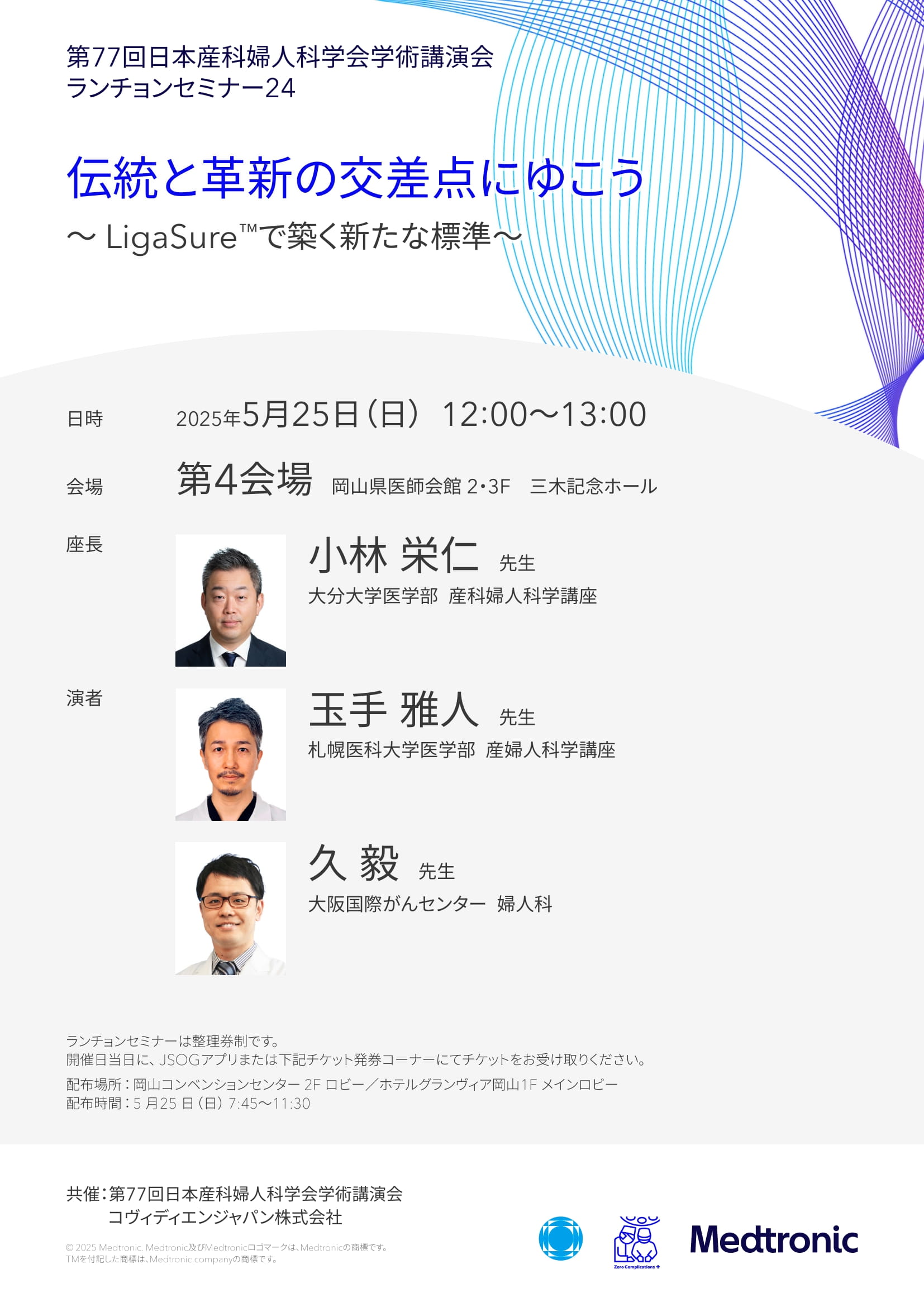 ランチョンセミナー24 伝統と革新の交差点にゆこう~LigaSure™で築く新たな標準~ 2025年5月25日(日) 12:00 - 13:00 第4会場 | 岡山県医師会館 2・3F 三木記念ホール 共催:コヴィディエンジャパン株式会社 |