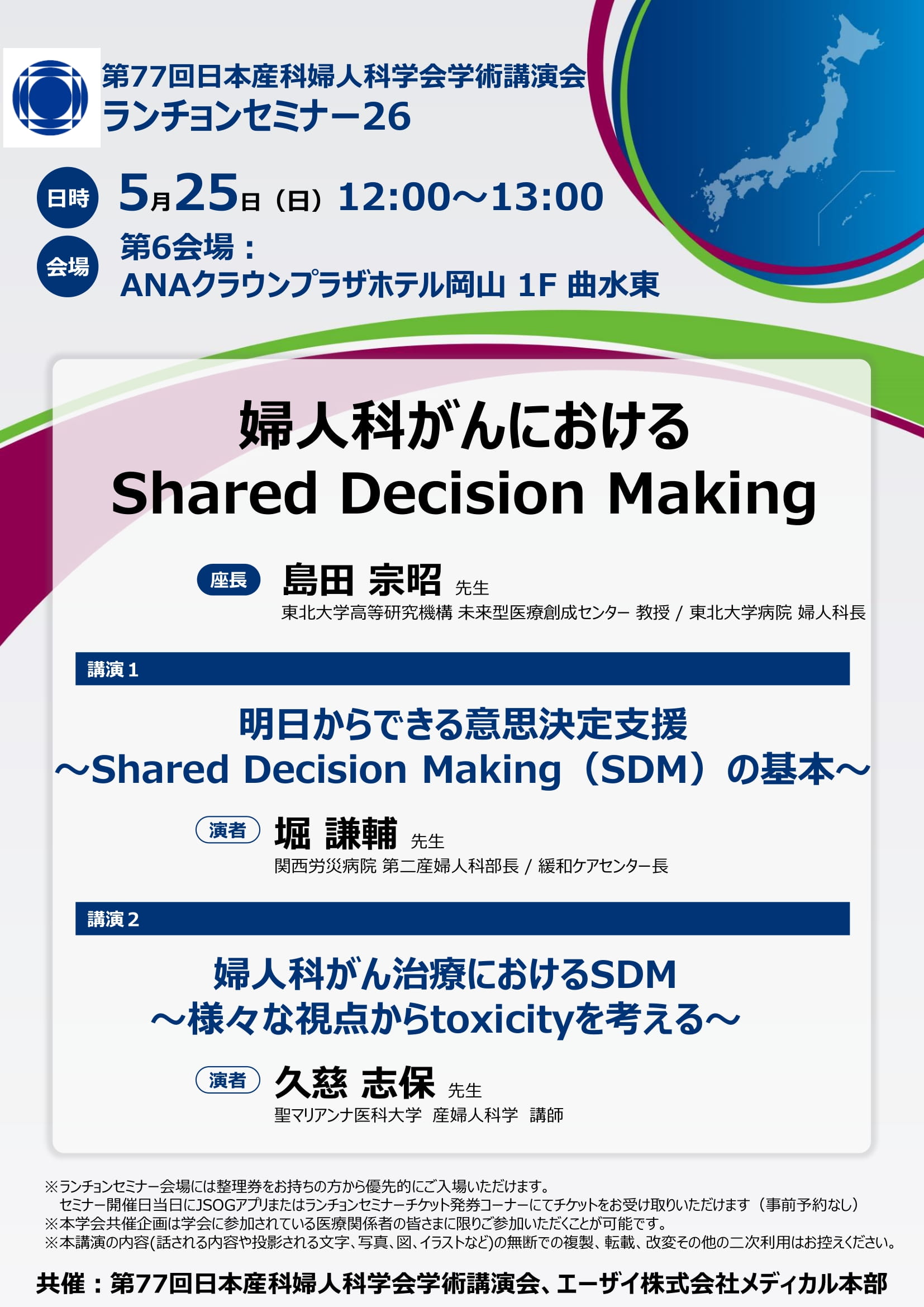ランチョンセミナー26 婦人科がんにおけるShared Decision Making 2025年5月25日(日) 12:00 - 13:00 第6会場 | ANAクラウンプラザホテル岡山 1F 曲水東 共催:エーザイ株式会社 |
