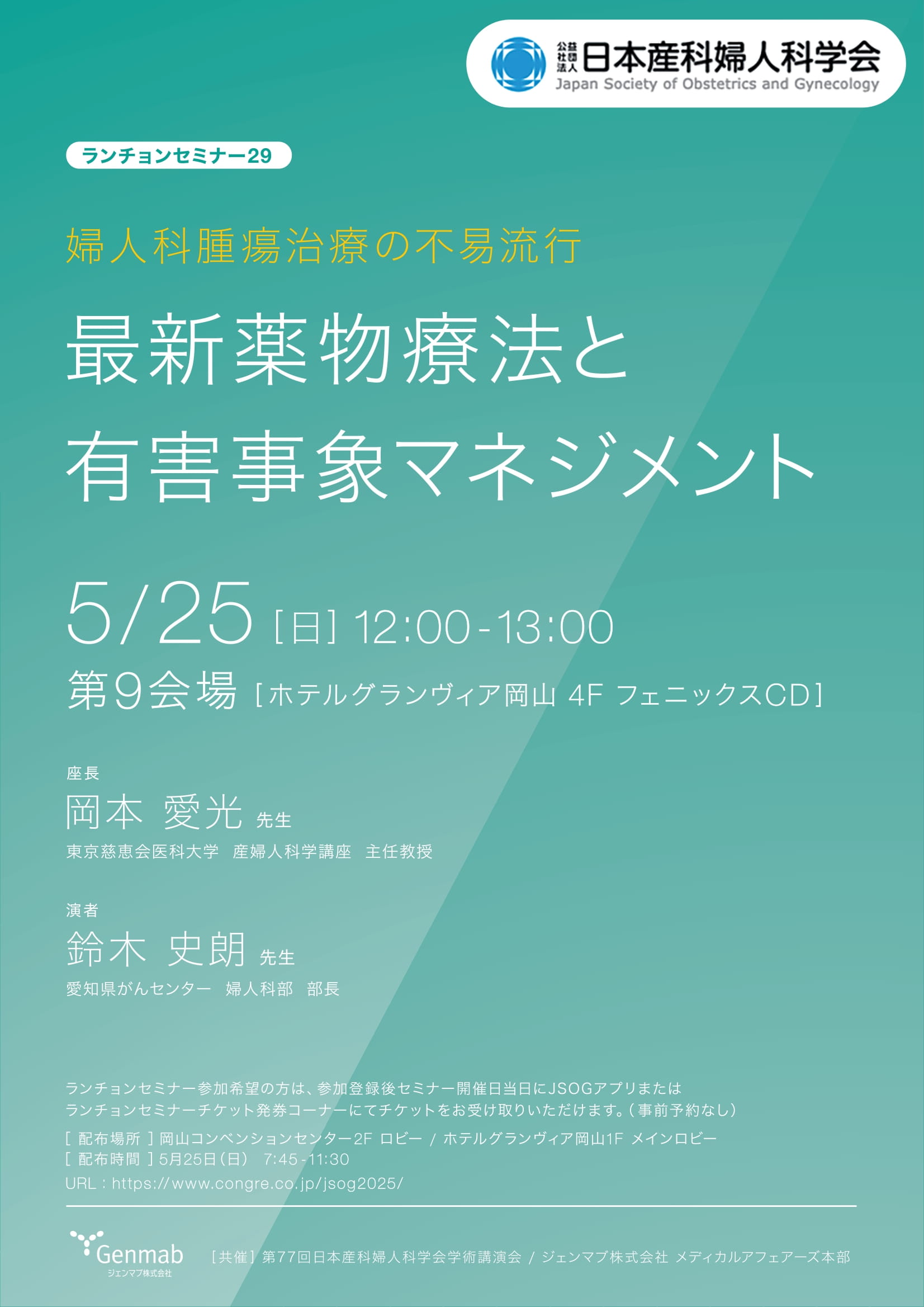 ランチョンセミナー29 婦人科腫瘍治療の不易流行:最新薬物療法と有害事象マネジメント 2025年5月25日(日) 12:00 - 13:00 第9会場 | ホテルグランヴィア岡山 4F フェニックスCD 共催:ジェンマブ株式会社メディカルアフェアーズ本部 |