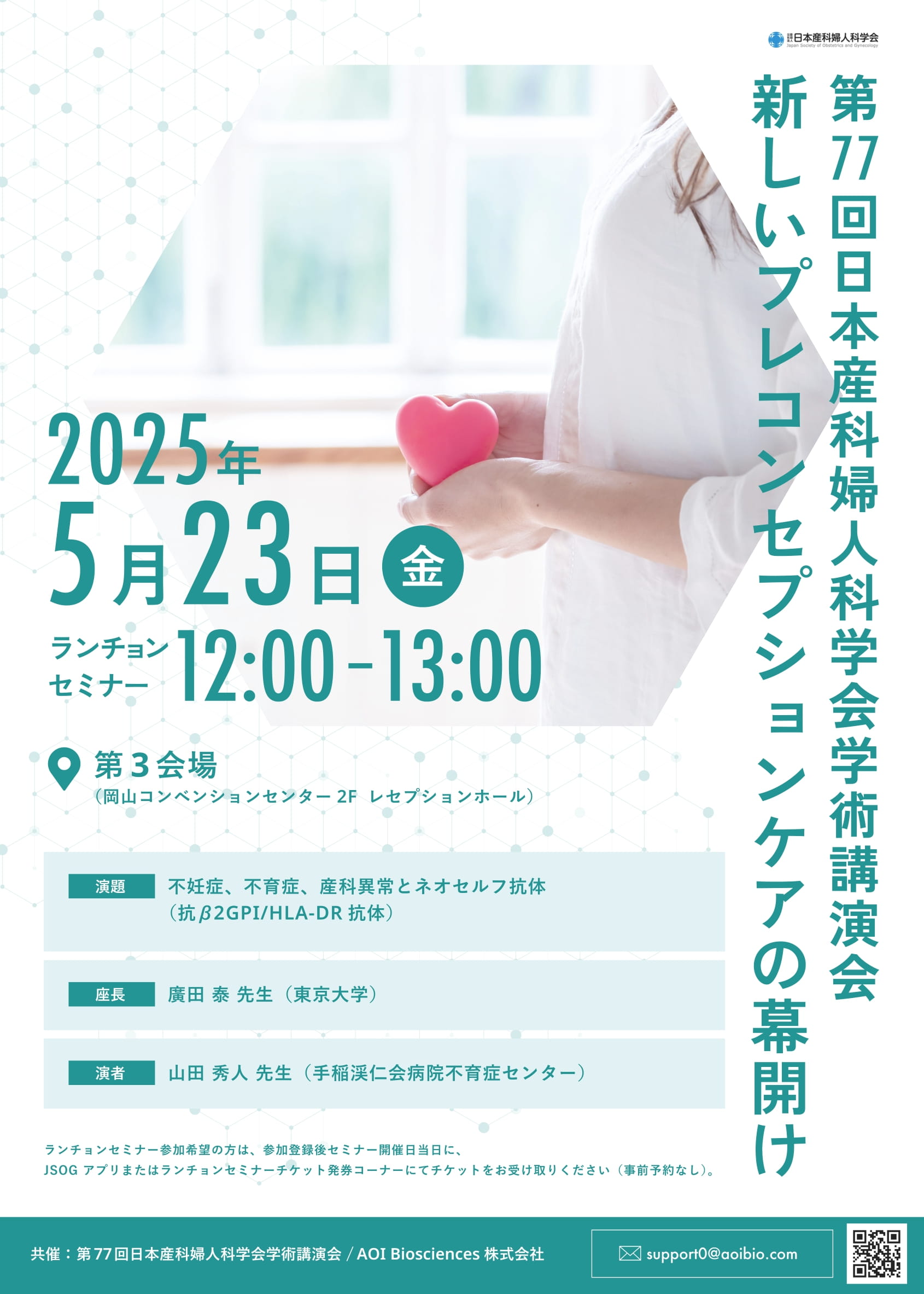 ランチョンセミナー3 新しいプレコンセプションケアの幕開け 2025年5月23日(金) 12:00 - 13:00 第3会場 | 岡山コンベンションセンター 2F レセプションホール 共催:AOI Biosciences株式会社 |