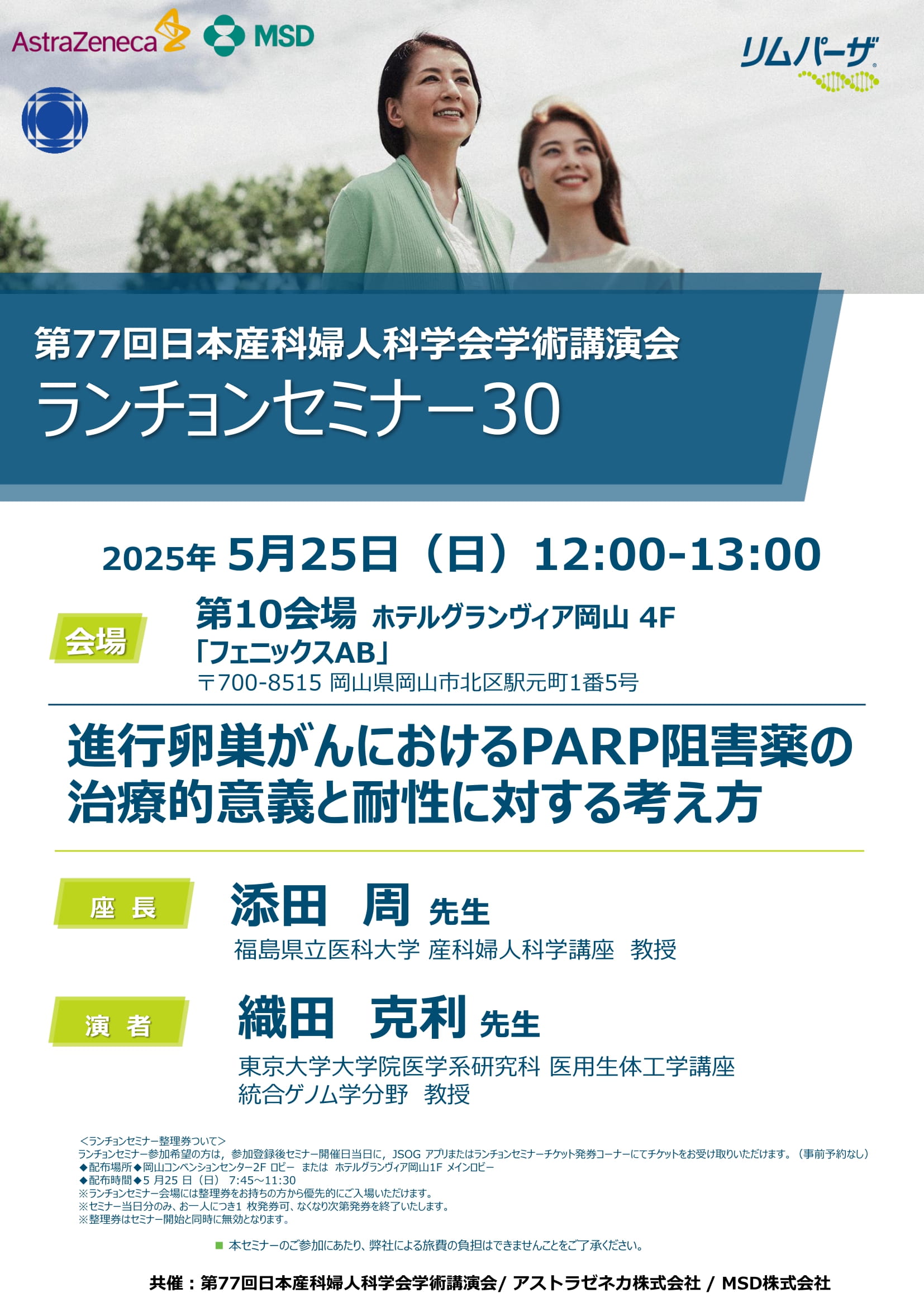 ランチョンセミナー30 進行卵巣がんにおけるPARP阻害薬の治療的意義と耐性に対する考え方 2025年5月25日(日) 12:00 - 13:00 第10会場 | ホテルグランヴィア岡山 4F フェニックスAB 共催:アストラゼネカ株式会社/MSD株式会社 |