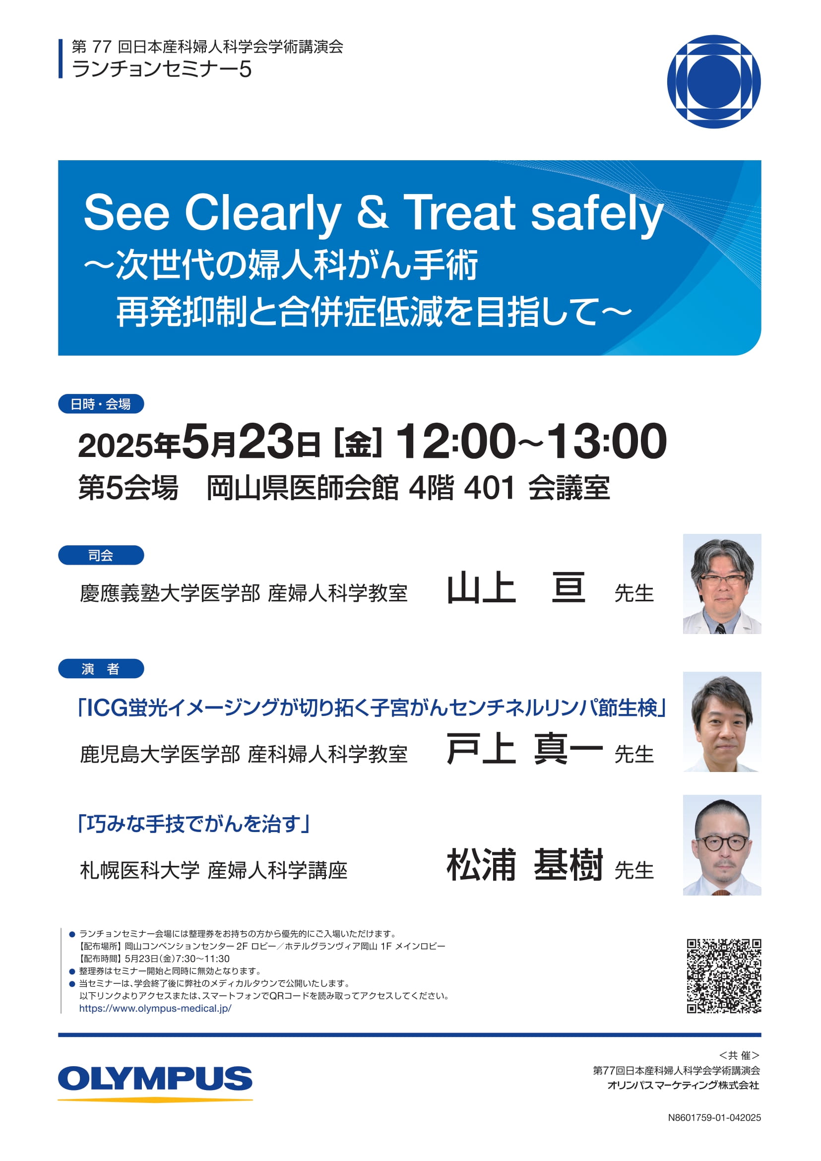 ランチョンセミナー5 See Clearly & Treat safely ~次世代の婦人科がん手術 再発抑制と合併症低減を目指して~ 2025年5月23日(金) 12:00 - 13:00 第5会場 | 岡山県医師会館 4F 401会議室 共催:オリンパスマーケティング株式会社 |