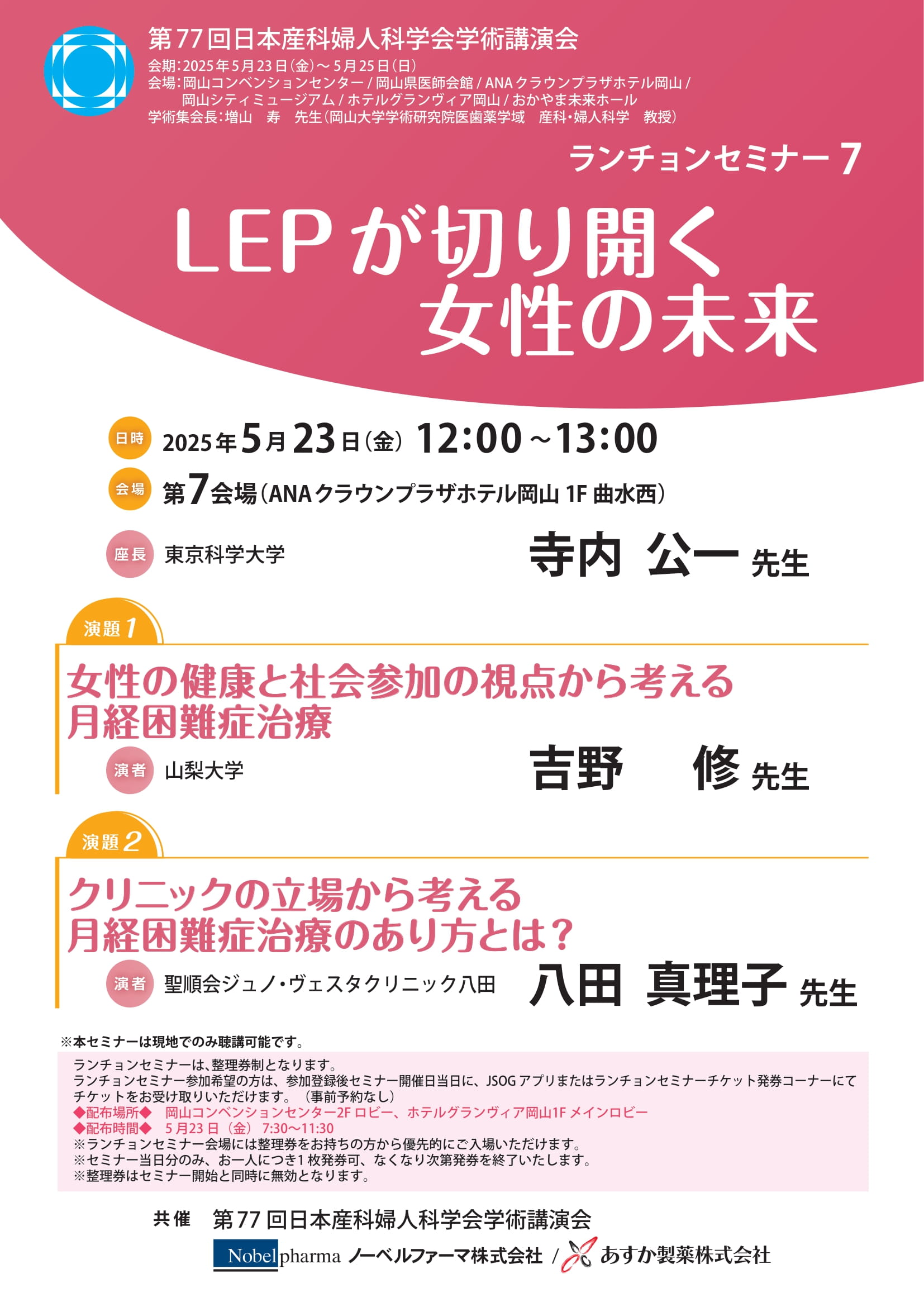 ランチョンセミナー7 LEPが切り開く女性の未来 2025年5月23日(金) 12:00 - 13:00 第7会場 | ANAクラウンプラザホテル岡山 1F 曲水西 共催:ノーベルファーマ株式会社/あすか製薬株式会社 |