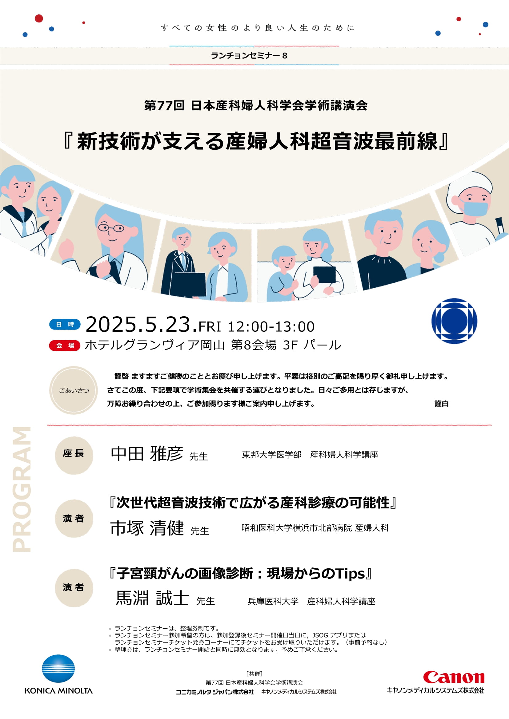 ランチョンセミナー8 新技術が支える産婦人科超音波最前線 2025年5月23日(金) 12:00 - 13:00 第8会場 | ホテルグランヴィア岡山 3F パール 共催:コニカミノルタジャパン株式会社/キヤノンメディカルシステムズ株式会社 |