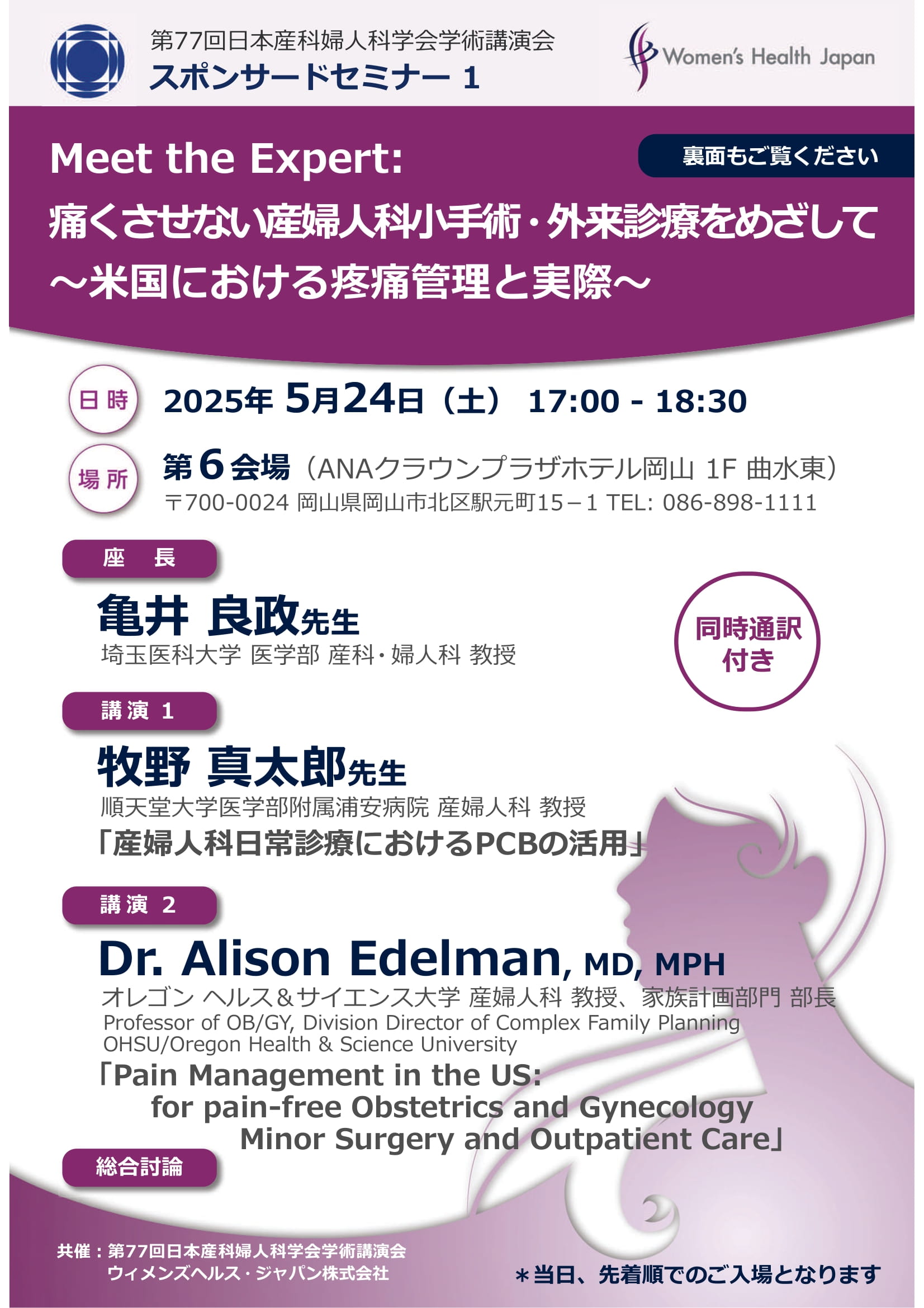 スポンサードセミナー1 Meet the Expert:痛くさせない産婦人科小手術・外来診療をめざして~米国における疼痛管理と実際~ 2025年5月24日(土) 17:00 - 18:30 第6会場 | ANAクラウンプラザホテル岡山 1F 曲水東 共催:ウィメンズヘルス・ジャパン株式会社 |