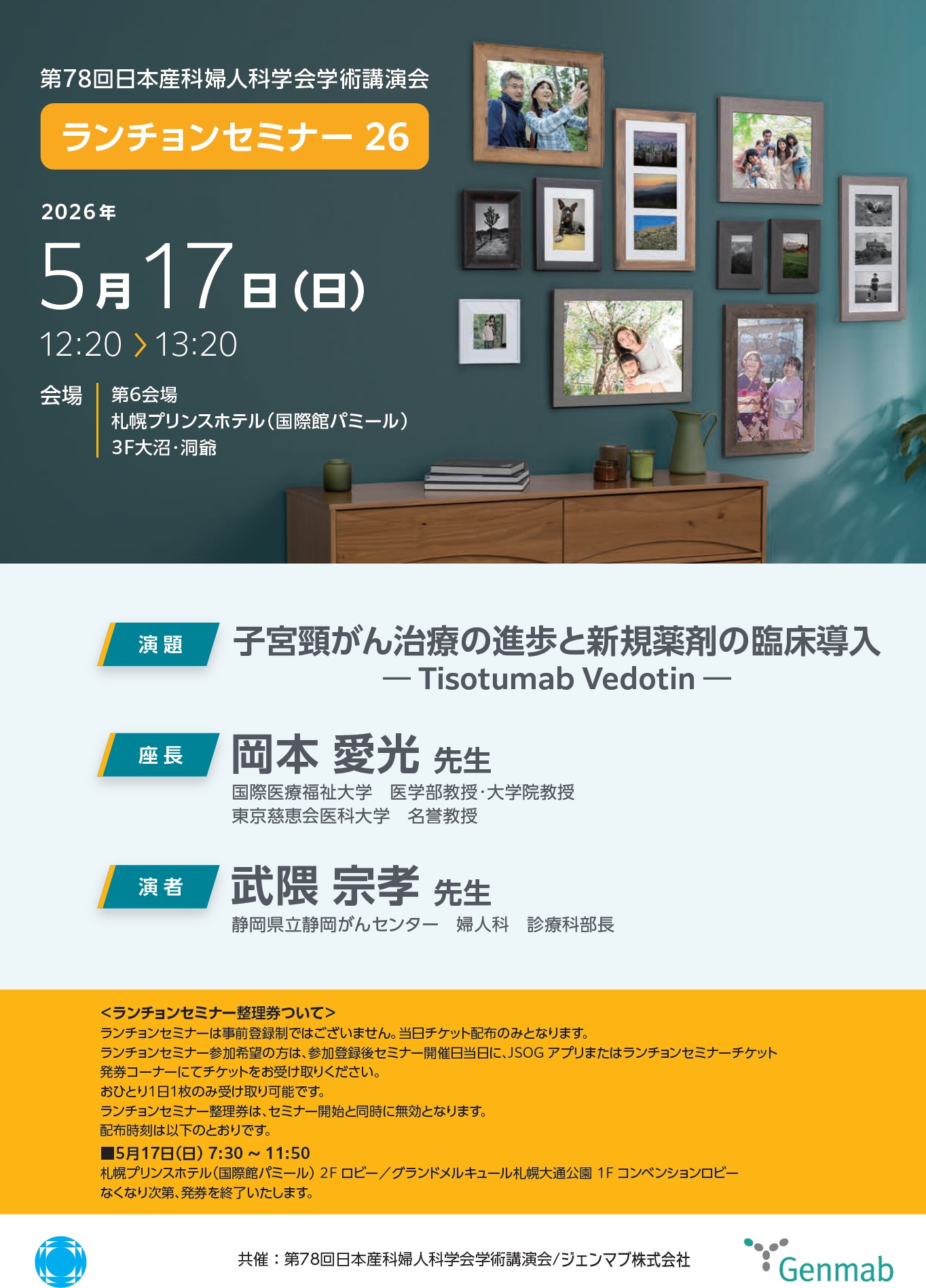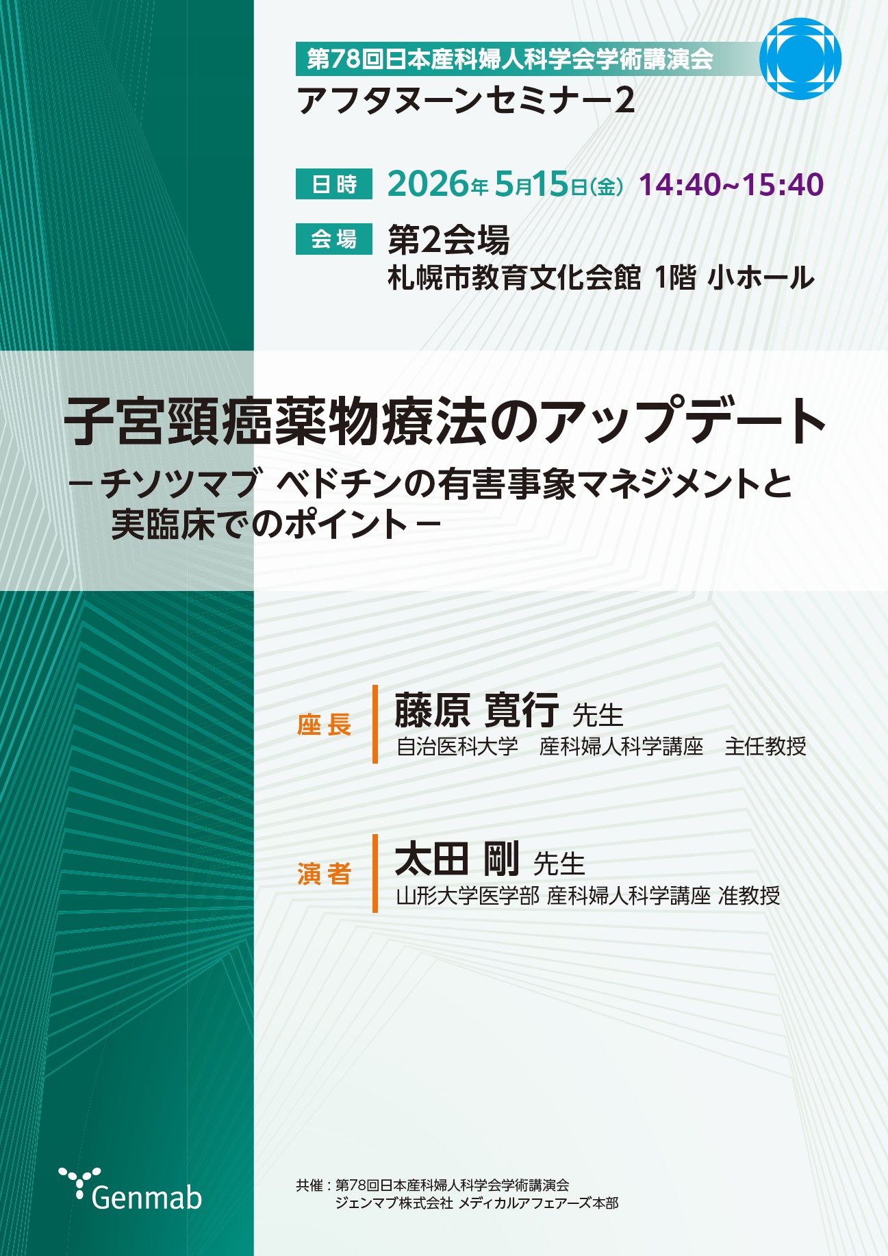 Stand by ランチョンセミナー26 子宮頸がん治療の進歩と新規薬剤の臨床導入 ― Tisotumab Vedotin ― 2026年5月17日(日) 12:20 - 13:20 第6会場 | 札幌プリンスホテル(国際館パミール) 3F 大沼・洞爺 共催:ジェンマブ株式会社 |