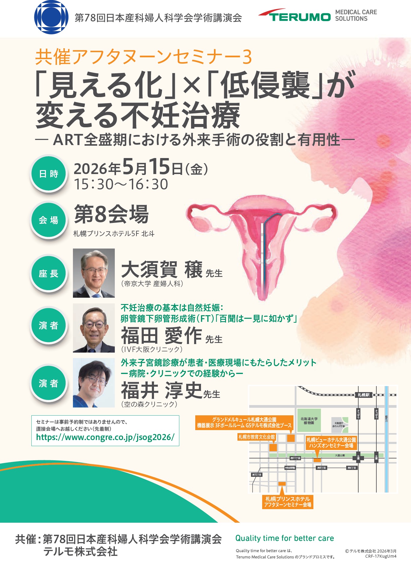 Stand by アフタヌーンセミナー3 「見える化」×「低侵襲」が変える不妊治療 ― ART全盛期における外来手術の役割と有用性― 2026年5月15日(金) 15:30 - 16:30 第8会場 | 札幌プリンスホテル(国際館パミール) 5F 北斗 共催:テルモ株式会社 |