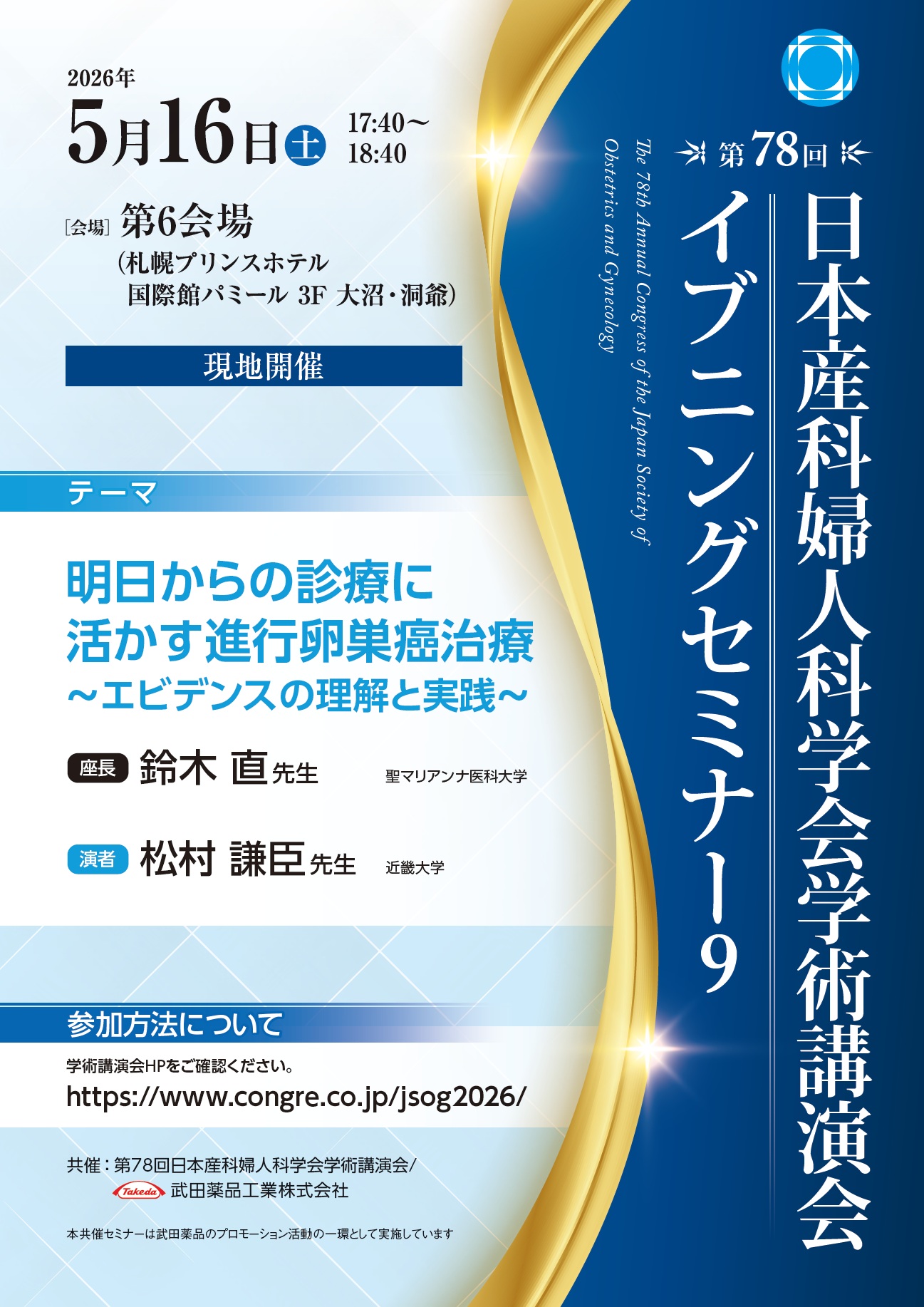 Stand by イブニングセミナー9 明日からの診療に活かす進行卵巣癌治療 ~エビデンスの理解と実践~ 2026年5月16日(土) 17:40 - 18:40 第6会場 | 札幌プリンスホテル(国際館パミール) 3F 大沼・洞爺 共催:武田薬品工業株式会社 |