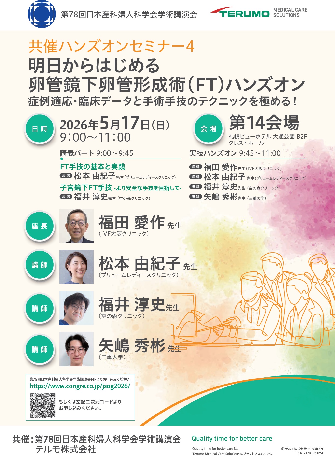 Stand by ハンズオンセミナー4 明日からはじめる卵管鏡下卵管形成術(FT)ハンズオン 症例適応・臨床データと手術手技のテクニックを極める! 2026年5月17日(日) 9:00 - 11:00 第14会場 | 札幌ビューホテル大通公園 B2F クレストホール 共催:テルモ株式会社 |