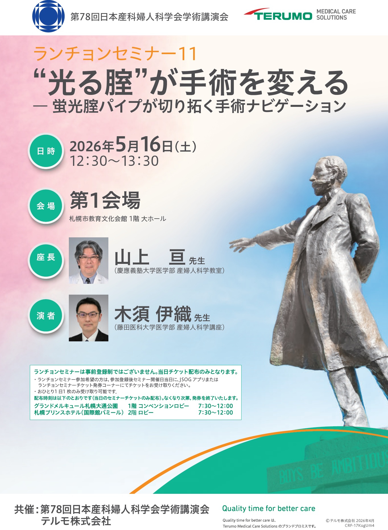Stand by ランチョンセミナー11 “光る腟”が手術を変える―蛍光腟パイプが切り拓く手術ナビゲーション 2026年5月16日(土) 12:30 - 13:30 第1会場 | 札幌市教育文化会館 1F 大ホール 共催:テルモ株式会社 |