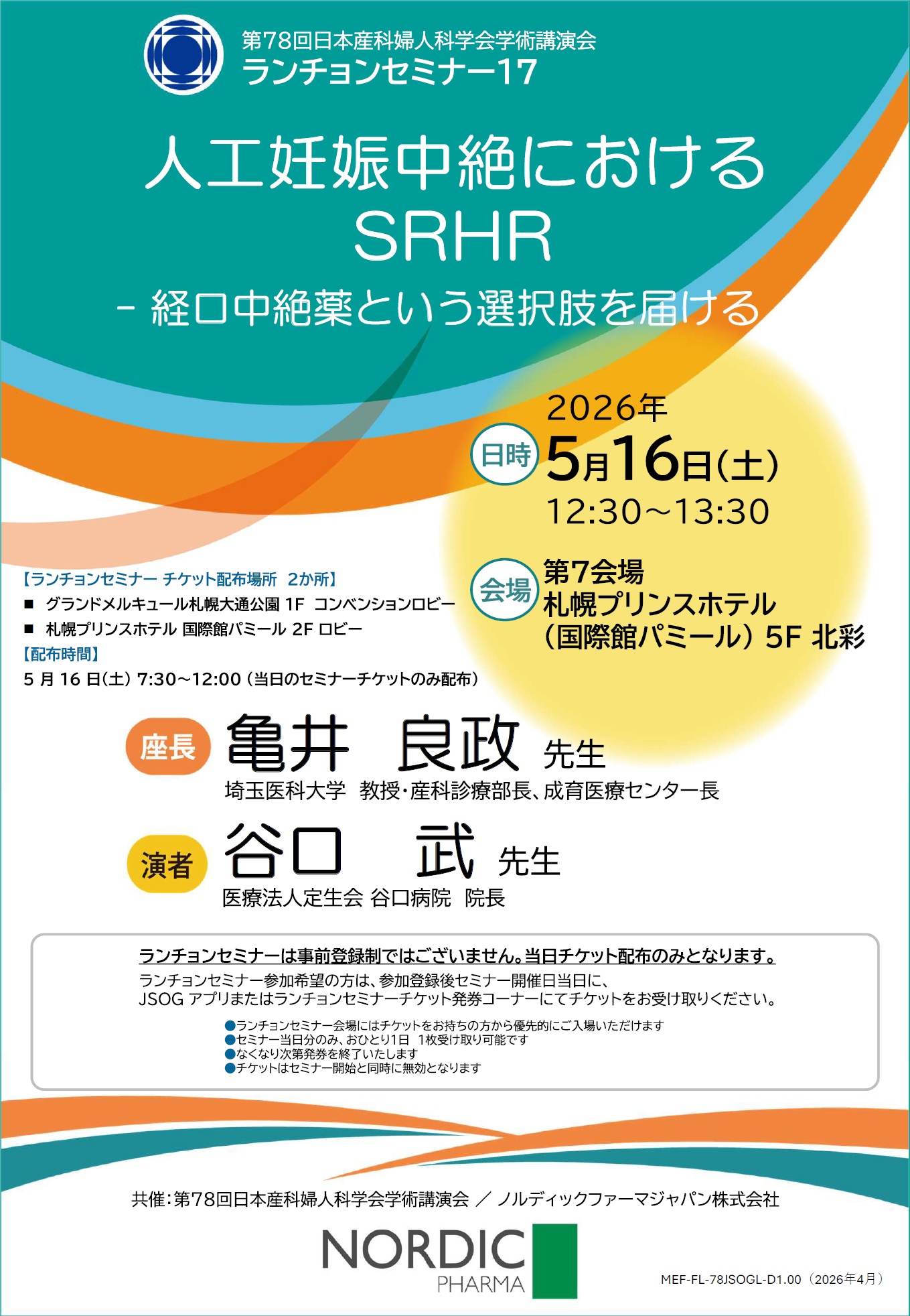 Stand by ランチョンセミナー17 人工妊娠中絶におけるSRHR ―経口中絶薬という選択肢を届ける 2026年5月16日(土) 12:30 - 13:30 第7会場 | 札幌プリンスホテル(国際館パミール) 5F 北彩 共催:ノルディックファーマジャパン株式会社 |