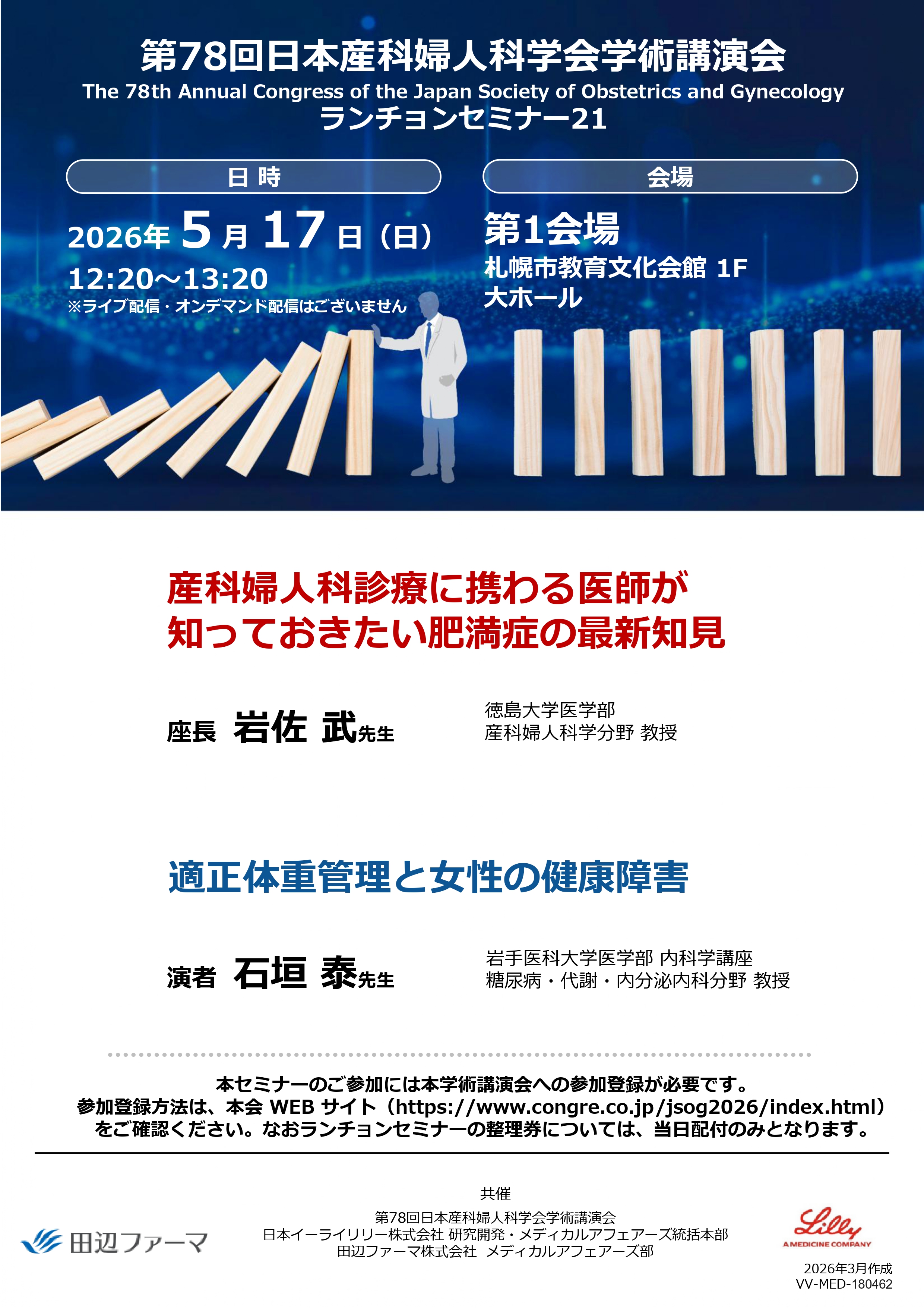 Stand by ランチョンセミナー21 産科婦人科診療に携わる医師が知っておきたい肥満症の最新知見 2026年5月17日(日) 12:20 - 13:20 第1会場 | 札幌市教育文化会館 1F 大ホール 共催:日本イーライリリー株式会社/田辺ファーマ株式会社 |