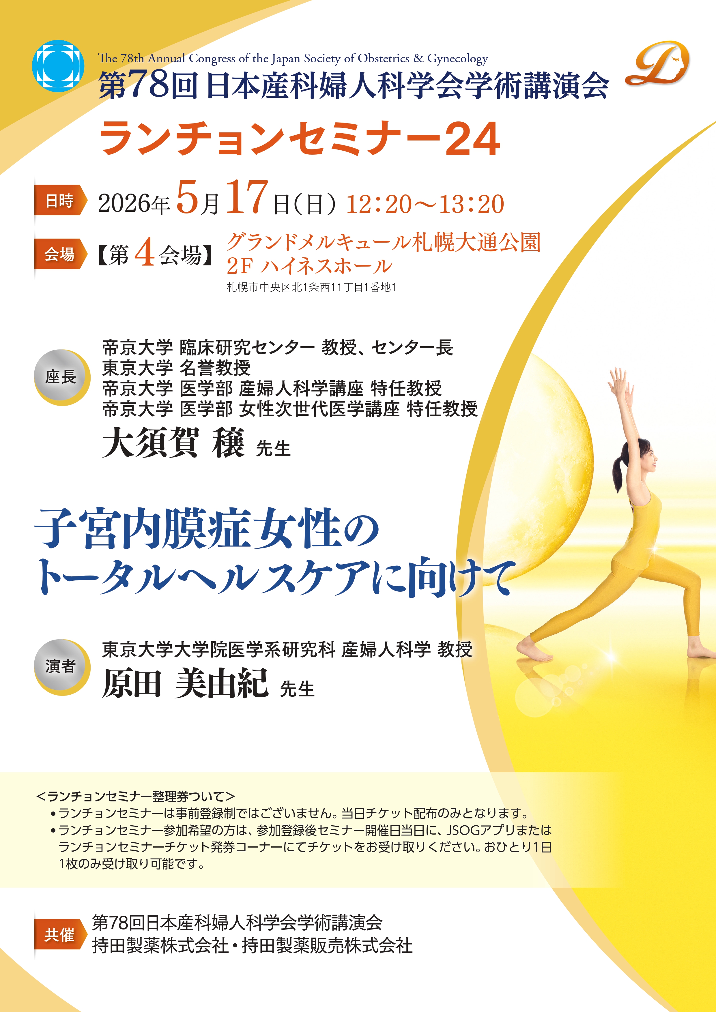 Stand by ランチョンセミナー24 月経困難症・子宮内膜症について 2026年5月17日(日) 12:20 - 13:20 第4会場 | グランドメルキュール札幌大通公園 2F ハイネスホール 共催:持田製薬株式会社/持田製薬販売株式会社 |